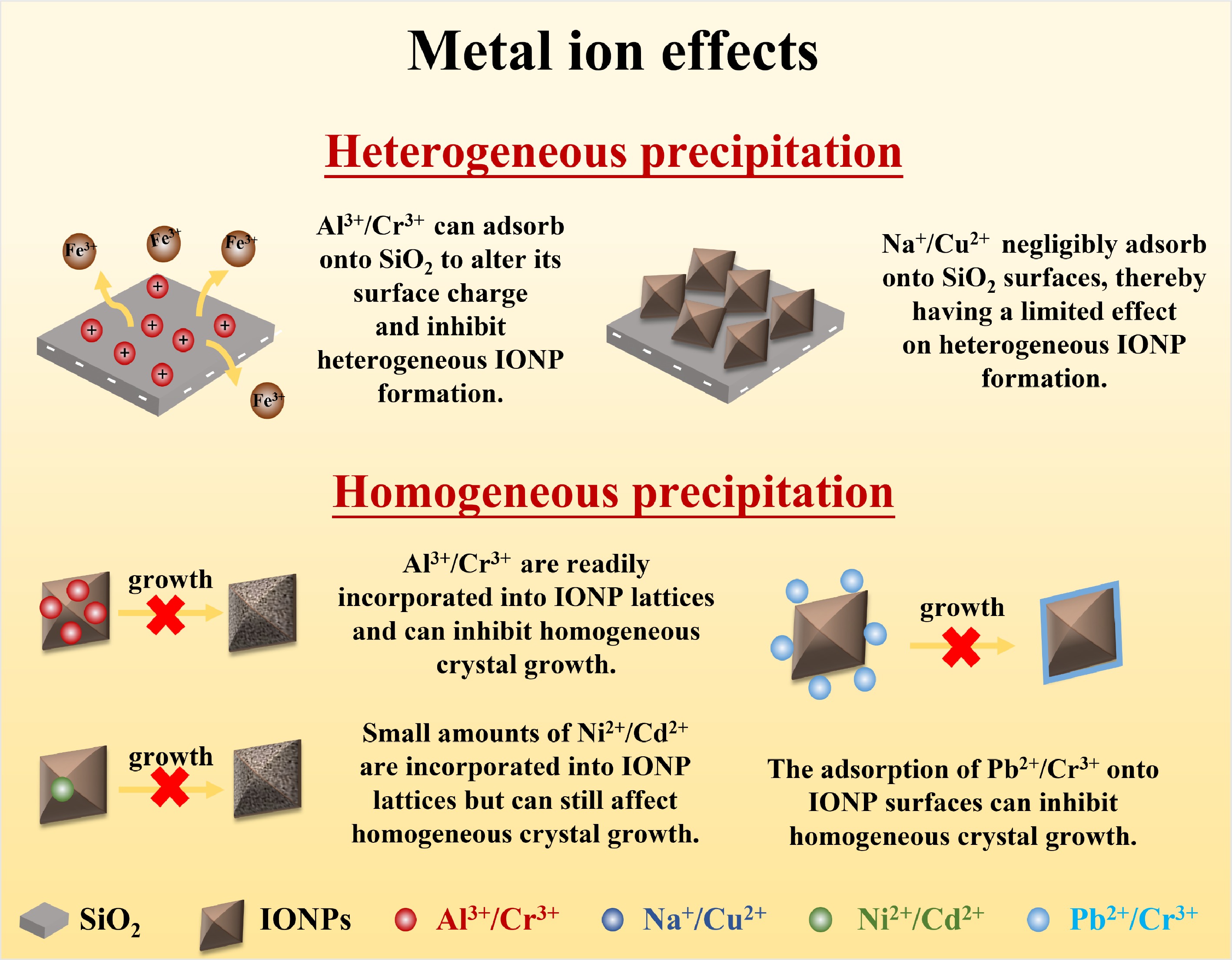 Metal cations can strongly influence IONP formation. Adsorbed multivalent ions can modify the surface charge or hydrophobicity of substrates to affect heterogeneous IONPs precipitation on substrates. Additionally, the lattice incorporation and surface adsorption of metal ions onto IONPs often inhibits homogeneous growth processes and yields smaller, poorly ordered particles.