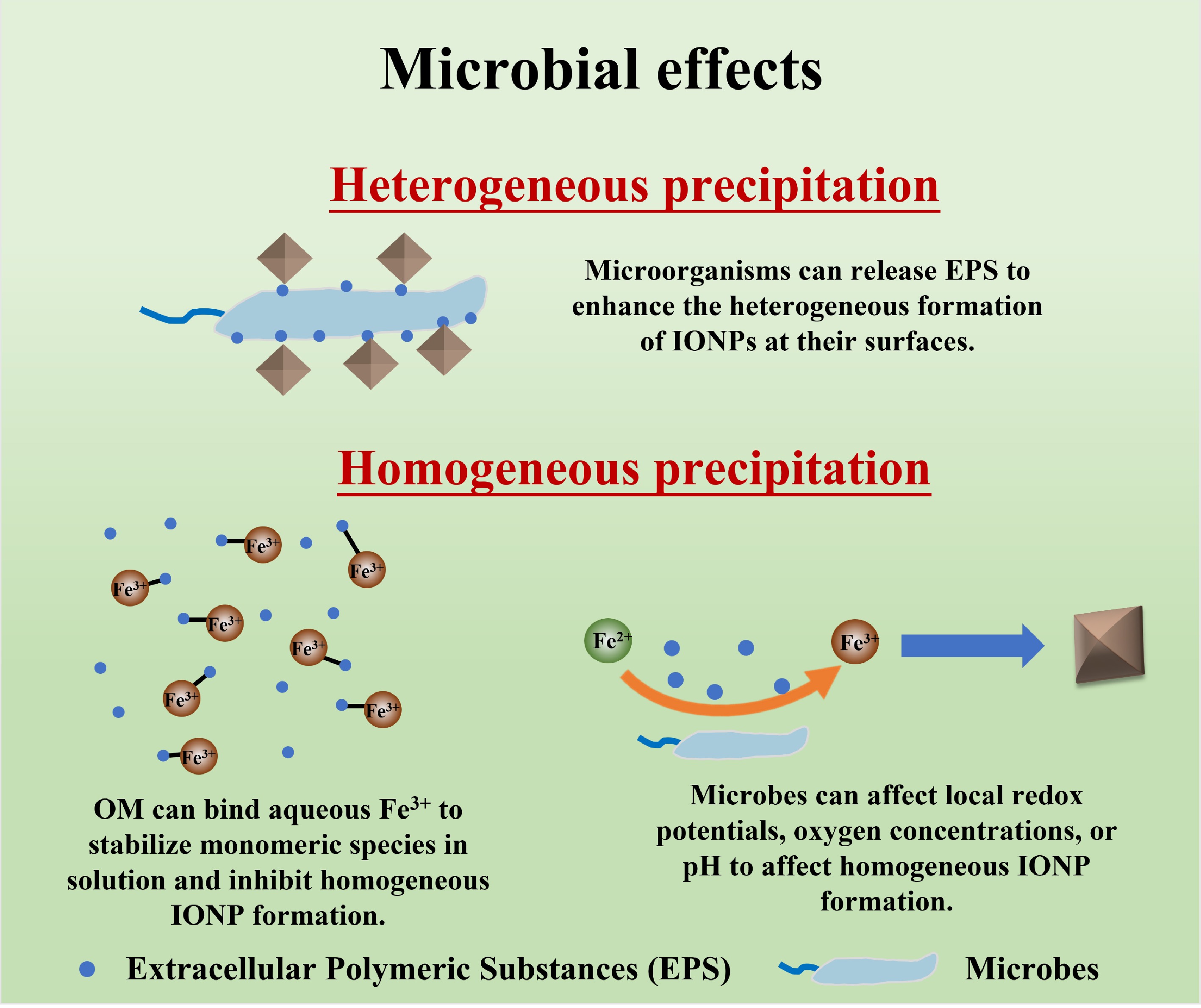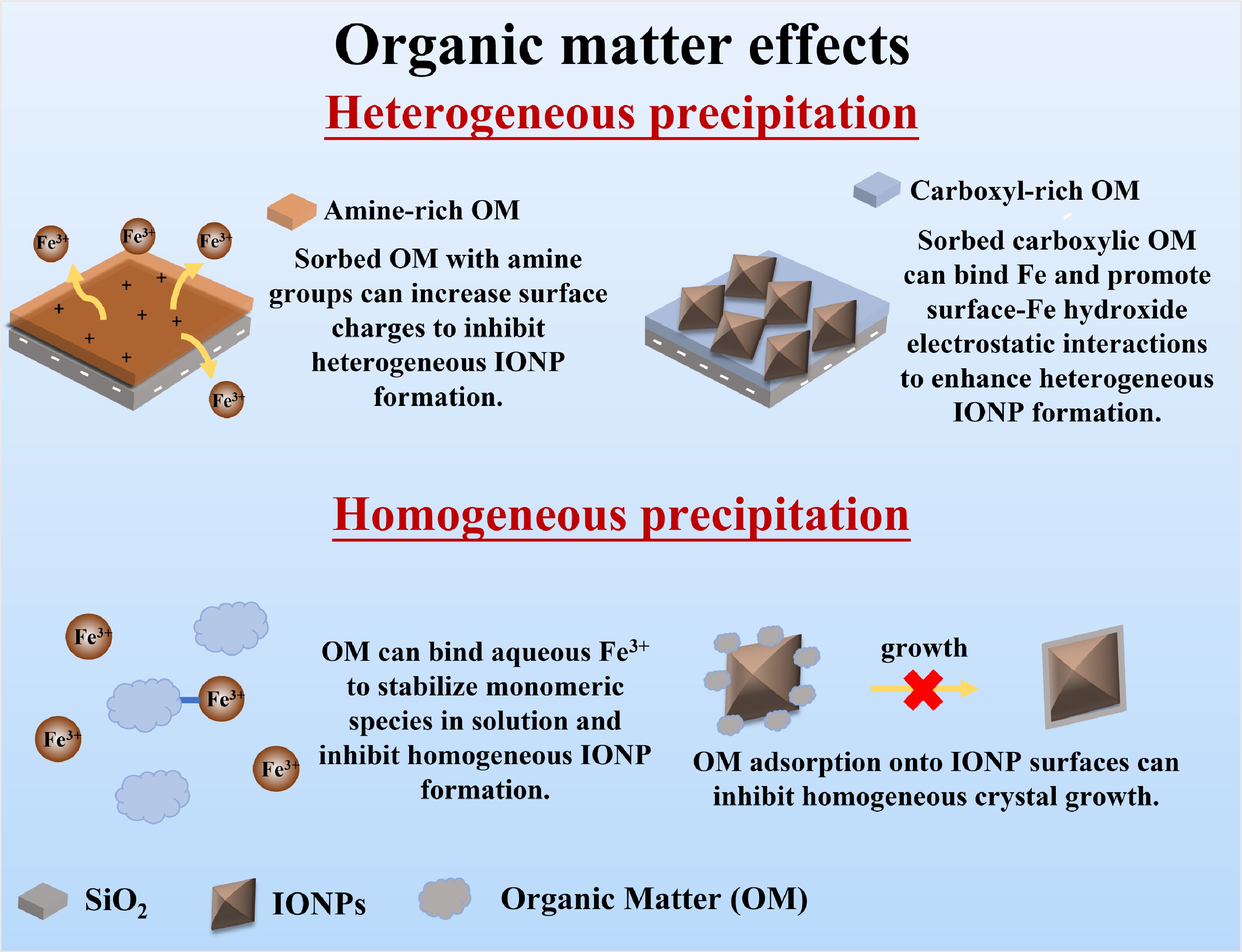 Organic adsorption and complexation with IONPs and substrates control their homogeneous and heterogeneous precipitation.