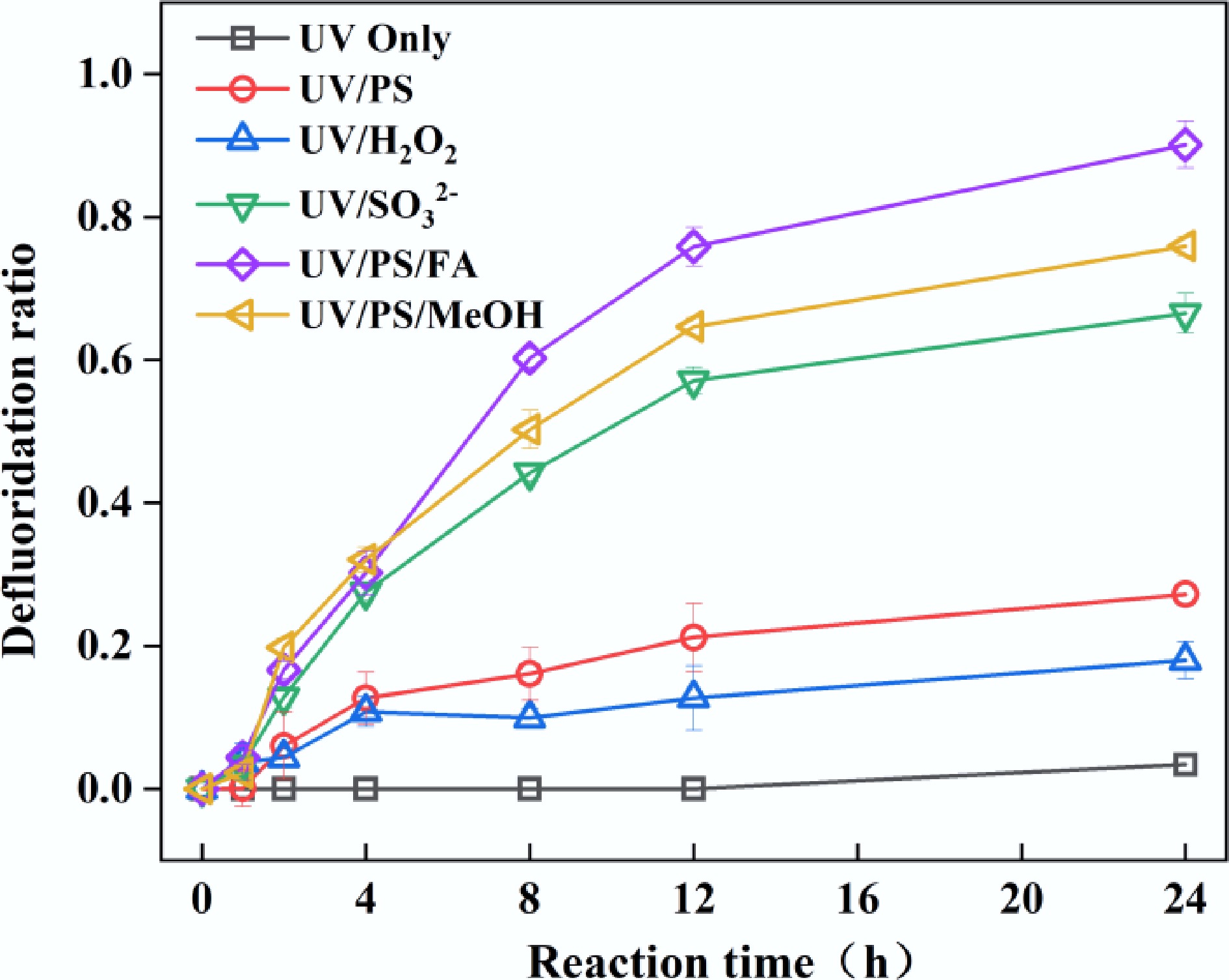 Based on this, the present study focuses on the defluorination mechanism of PFOA by reductive radicals in the UV/PS/FA system. The research encompasses several critical aspects, including the comparative analysis of PFOA defluorination across various redox systems. It aims to elucidate the mechanisms underlying the defluorination of PFOA in the UV/PS/FA system. Additionally, the study will investigate the influence of various factors, including PS and FA concentrations, pH levels, and the presence of coexisting anions and organic compounds, on the defluorination of PFOA. These findings provide new perspectives for the efficient defluorination of perfluorinated compounds.