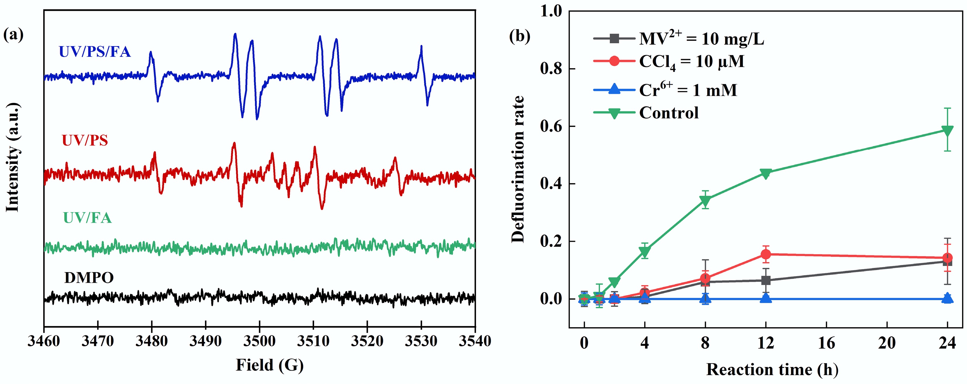 (a) EPR analysis of UV/PS/FA, UV/PS, and UV/FA systems. (b) Free radical quenching experiments. Reaction conditions: PFOA = 20 µM, initial pH of 2.5, anaerobic environment. (a) PS = 2 mM, FA = 15 mM, DMPO = 100 mM, reaction time = 5 min, anaerobic environment. (b) PS = 4 mM, FA = 2 mM, MV2+ = 10 mg/L, CCl4 = 10 µM, Cr(VI) = 1 mM.