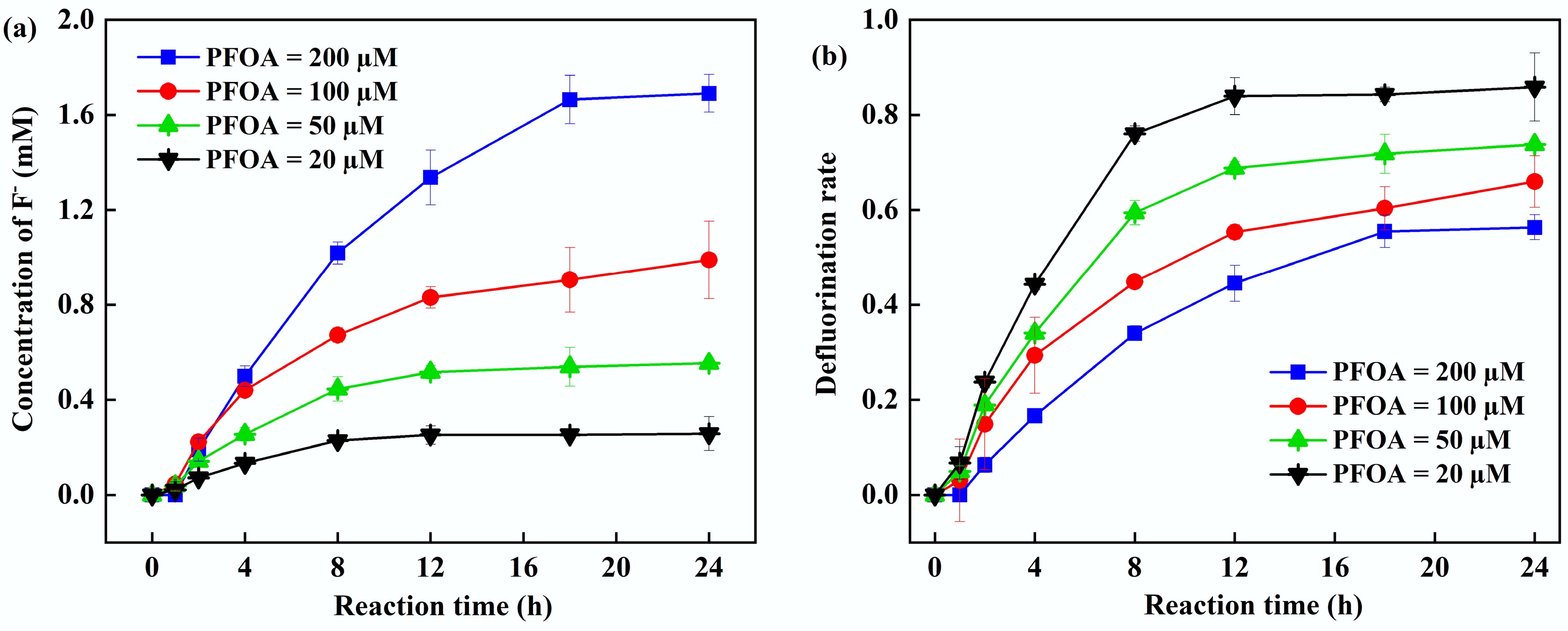 (a) Fluoride ion concentration. (b) Defluorination rate at different initial PFOA concentrations. Reaction conditions: PFOA = 20–200 µM, PS = 5 mM, FA = 2 mM, initial pH of 2.5, anaerobic environment.