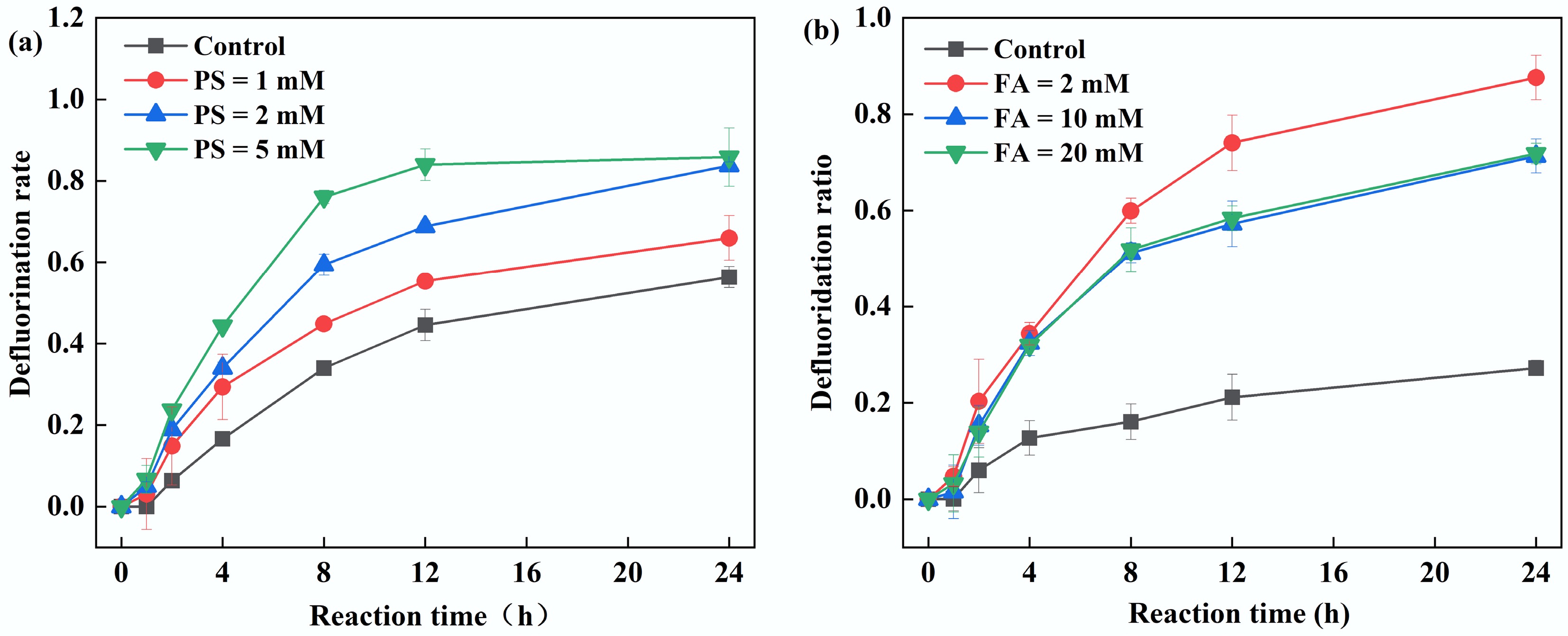 Effect of (a) PS, and (b) FA concentration on PFOA defluorination by the UV/PS/FA system. Reaction conditions: PFOA = 20 µM, initial pH of 2.5, anaerobic environment. (a) PS = 1–5 mM, FA = 2 mM. (b) PS = 5 mM, FA = 2–20 mM.