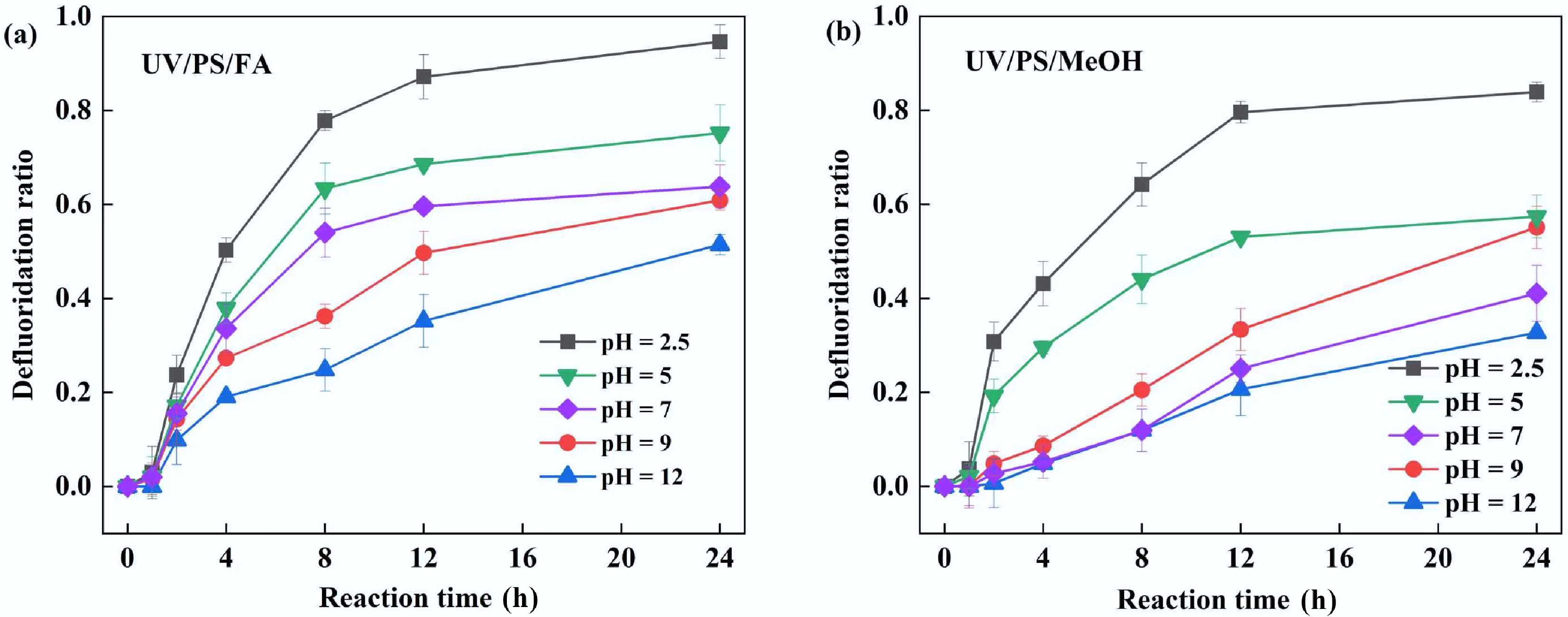 Effect of initial pH on PFOA defluorination in (a) UV/PS/FA and (b) UV/PS/MeOH systems. Reaction conditions: PFOA = 20 µM, PS = 4 mM, initial pH = 2.5, 5, 7, 9, 12, anaerobic environment. (a) FA = 2 mM. (b) MeOH = 2 mM.