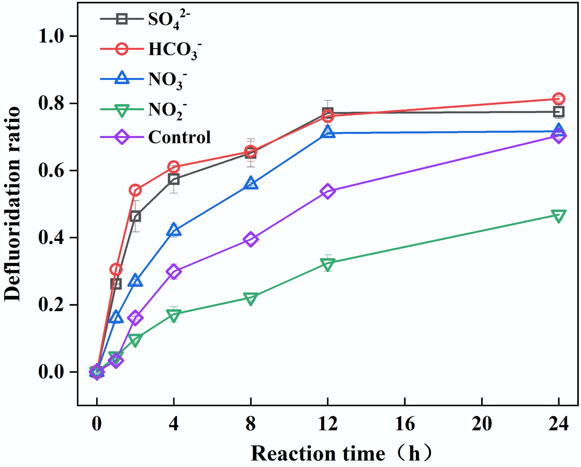Effect of NO3−, NO2−, SO42−, and HCO3− on PFOA defluorination. Reaction conditions: PFOA = 20 µM, PS = 4 mM, FA = 2 mM, NO3−, NO2−, SO42−, HCO3− = 10 mM, unadjusted pH, anaerobic environment.