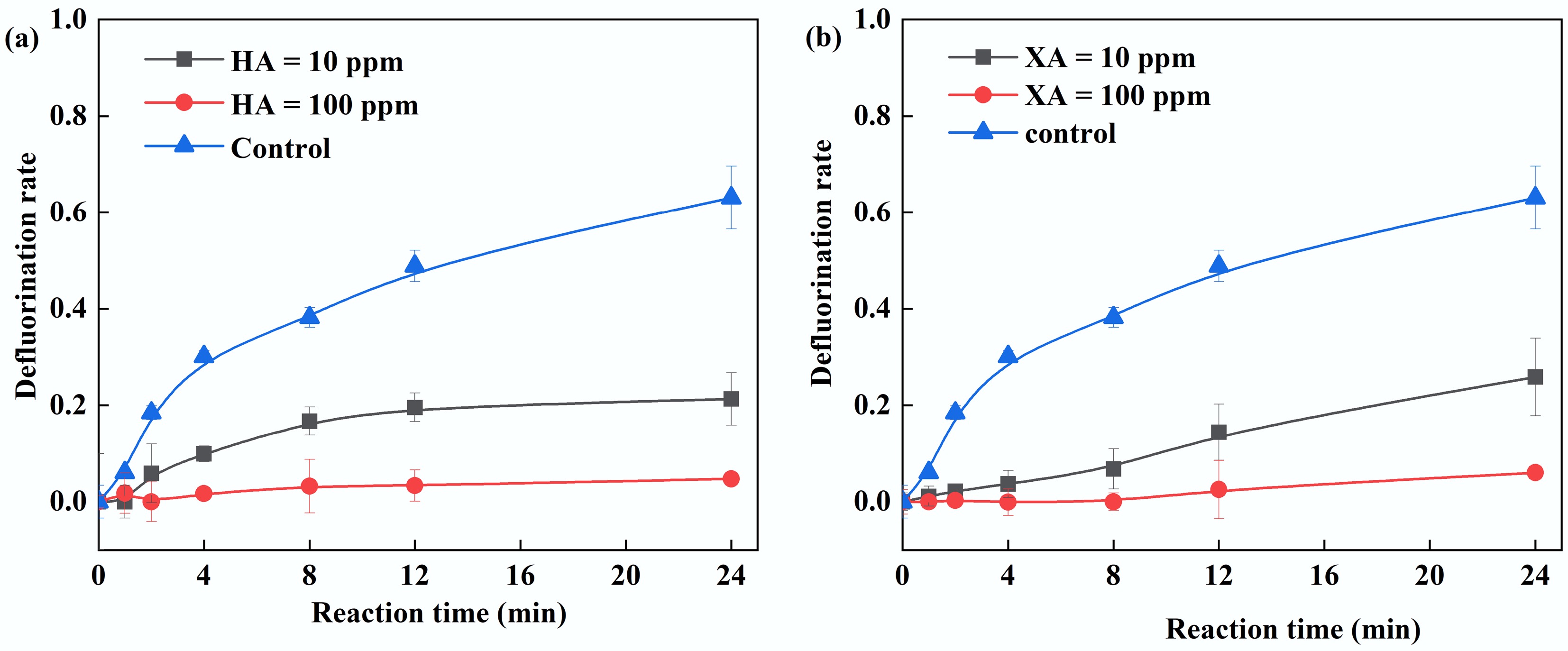 Humic acid (HA) and xanthohumic acid (XA), as representative components of natural organic matter, possess molecular structures rich in redox-active functional groups such as phenolic hydroxyl and quinonyl moieties[53,54]. These constituents can interfere with advanced oxidation processes by competing for radicals or altering reaction pathways. This study investigates the inhibitory effects and mechanisms of HA/XA on PFOA degradation in the UV/PS/FA system. The findings indicate a significant dose-dependent inhibitory effect of HA/FA on the defluorination of PFOA. Notably, the defluorination efficiency fell below 10% at 10 ppm HA/XA and approached near complete cessation at 100 ppm (Fig. 7). This inhibition originates from the preferential reaction between phenolic/quinonoid groups in HA/XA and reactive radicals (SO4•−, •OH)[55], which prevents the formation of the critical intermediate CO2•−. Additionally, carbonyl groups (C=O) in HA/FA can further react with CO2•−, ultimately suppressing PFOA defluorination.