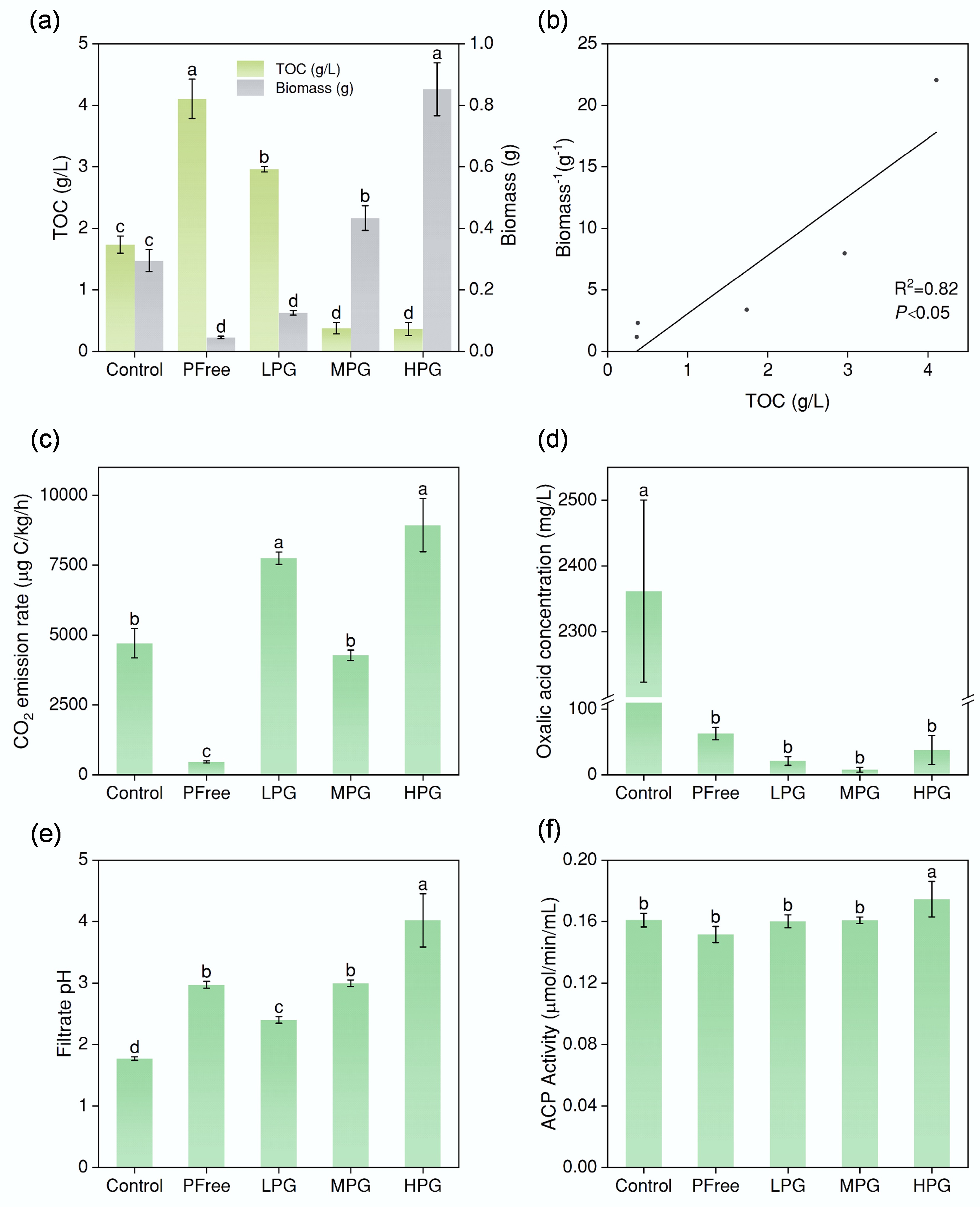 Incubation effect of A. niger. (a) Biomass, and TOC content of filtrate after six days of incubation under different treatments. (b) The correlation between TOC values and the reciprocal of biomass. (c) CO2 emission rates of the system. (d) Concentrations of oxalic acid secreted by A. niger. (e) pH values of the filtrate after incubation for six days. (f) acid phosphatase activity of filtrate after incubation for six days. (The lowercase letter labels in the figure indicate significant differences among different treatments. If two treatments contained the same lowercase letter, there was no significant difference between them; otherwise, there was a significant difference).
