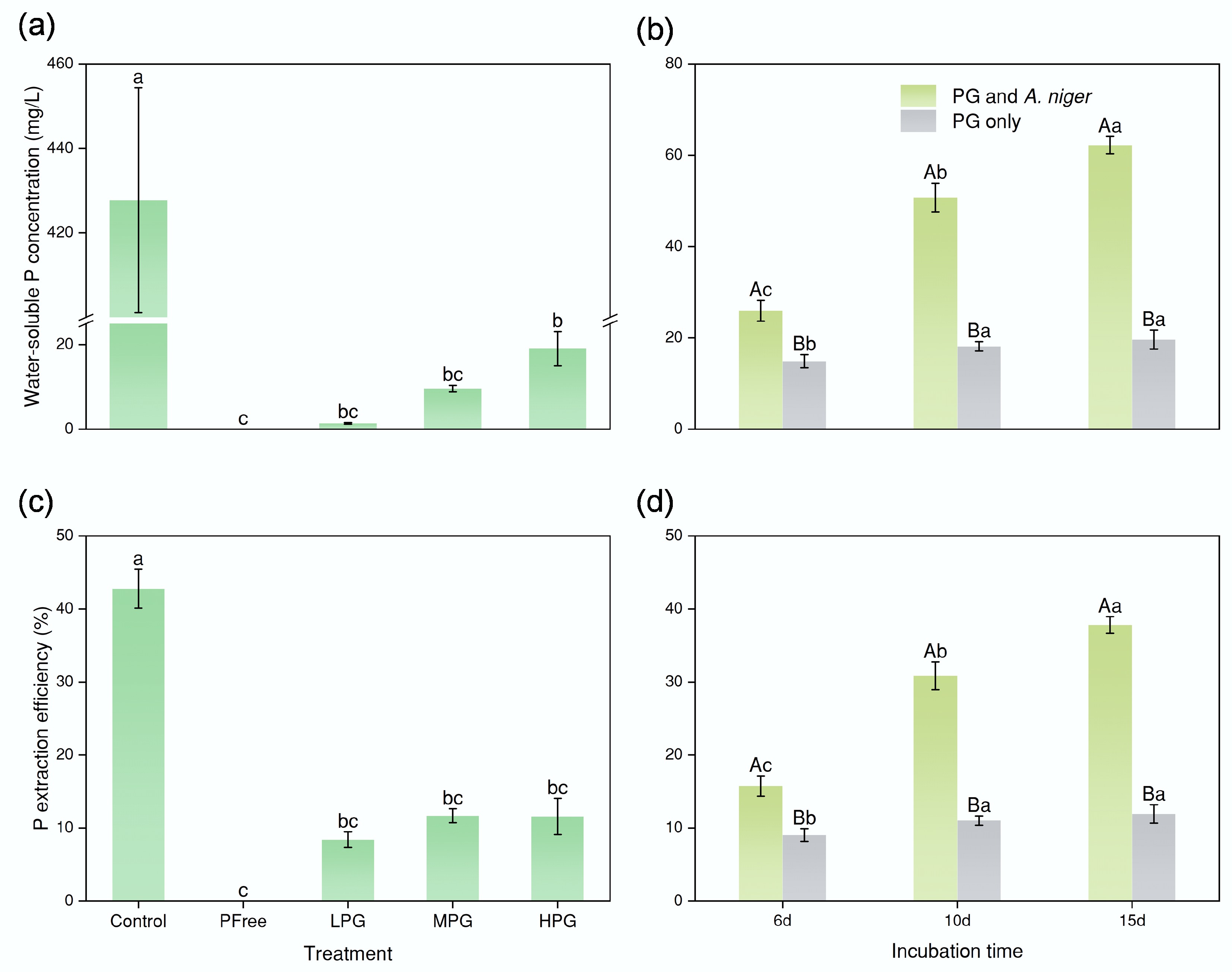 Effect of bioextraction of P. (a) and (c) concentrations of water-soluble P and P bioextraction efficiency by A. niger after six days of incubation. (b) and (d) concentrations of water-soluble P and P extraction efficiency after six, 10, and 15 d of incubation, respectively (the P involved in the figure pertained solely to P presented in the solution, excluding P in fungal pellets). In (a) and (c), the lowercase letter labels indicate significant differences among different treatments. If two treatments had the same lowercase letter, there was no significant difference; otherwise, there was a considerable difference. In (b) and (d), the capital letter labels indicate whether there was a substantial difference between the treatments PG only or PG and A. niger at the same incubation time. The lowercase letters indicate significant differences among incubation times within each treatment (PG only or PG and A. niger). The method for determining substantial differences was consistent with the above.