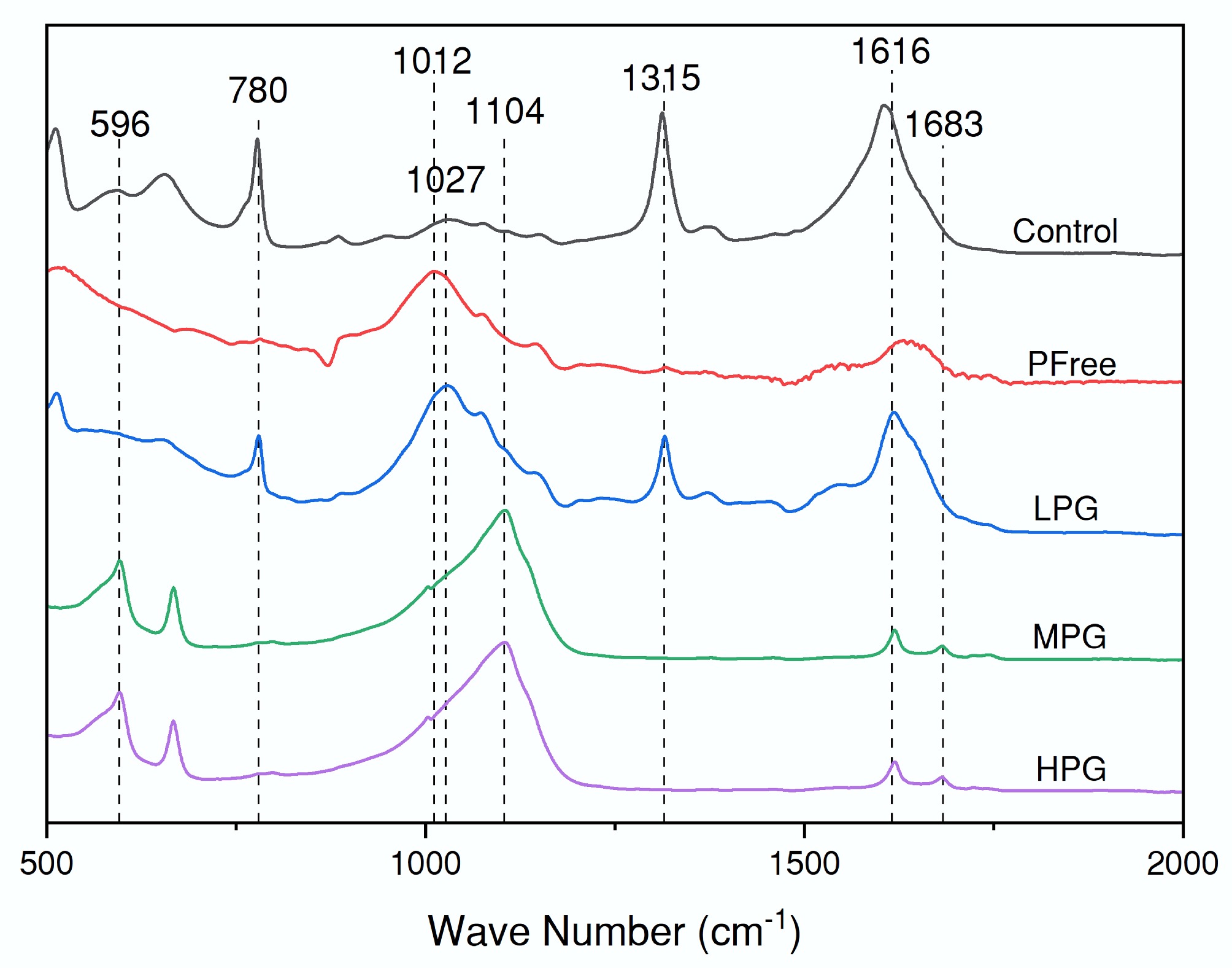 • In the ATR-IR spectra (Fig. 3), the absorption band at 596 cm−1 was characteristic of phosphate P-O vibrational modes[46]. This peak displayed maximal intensity in MPG and HPG treatments (Fig. 3). The absorption band at 780 cm−1 was attributed to P-O vibration based on HPO42−. This peak was prominent in both Control and LPG treatments (but with higher intensity in the Control treatment) (Fig. 3). The absorption band at 1,012 cm−1 was assigned to C–O and C–C vibrations from microbial polysaccharides[47,48], which was prominent in PFree treatment (Fig. 3). The 1,027 cm−1 band represented ν1 and ν3 P-O vibration of PO43− (Fig. 3)[49,50]. Compared with the Control treatment, the intensity of this peak was significantly enhanced in the LPG treatments (Fig. 3). At 1,104 cm−1, the spectrum exhibited a mixed vibrational mode resulting from the combination of P-O (for PO43−) and S-O (for SO42−)[51]. The intensity distribution of this peak was similar to that of the 596 cm−1 peak (Fig. 3). As the mass of PG increased, there was more SO42− in the system, and the intensity of this peak got stronger (Fig. 3). The absorption band at 1,315 cm−1 represented symmetric stretching vibrations of C-O from C2O42− while that at 1,616 cm−1 represented the asymmetric stretching vibrations from HC2O4−[52]. Both peaks were characteristic of oxalic acid (Fig. 3). The 1,683 cm−1 peak represented the C=O stretching vibration (Fig. 3)[53]. The intensity of the three peaks above in the spectra of Control and LPG treatments was higher than that in MPG and HPG treatments (Fig. 3). When the mass of PG reached 0.5 g, the peaks of oxalic acid functional groups were masked by the peak of S-O vibration in PG (Fig. 3).