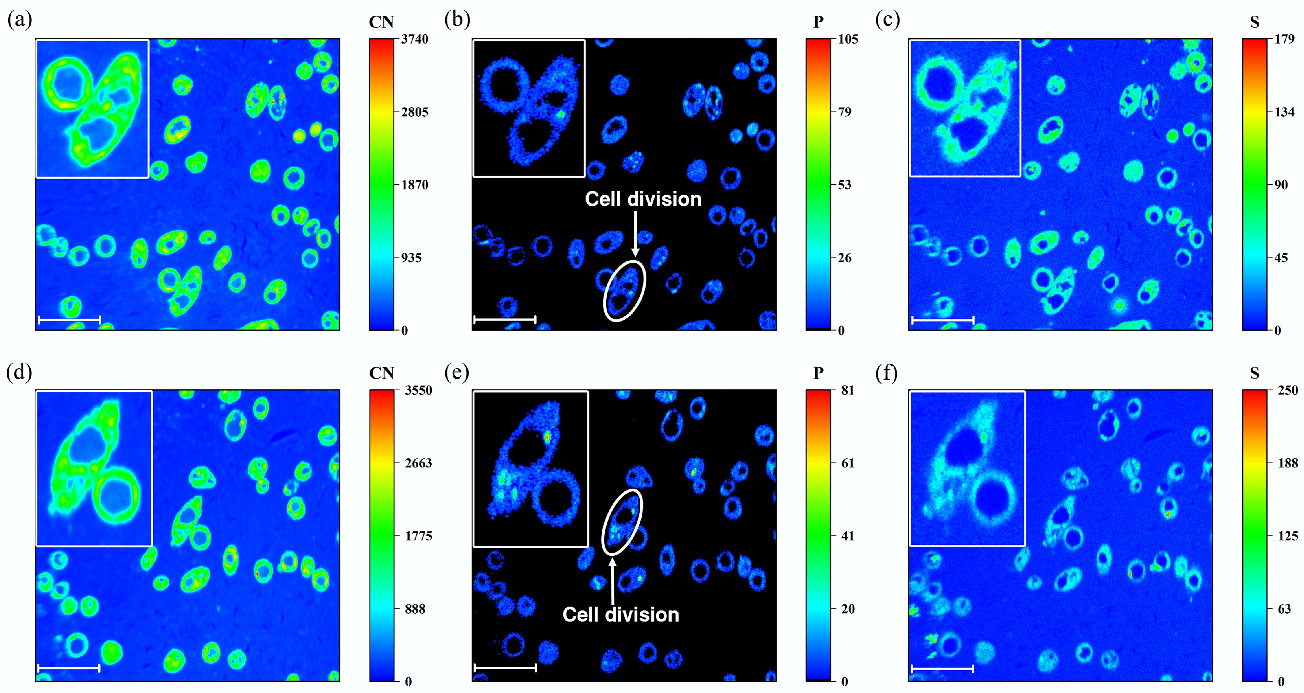 NanoSIMS images of High PG treatment after 6 days of incubation. (a) and (d) CN element distribution. (b) and (e) P element distribution. (c) and (f) S element distribution. (a)−(c) were from the same region, while figures (d)−(f) were from another region. The scale bar of all the figures was 10 μm.