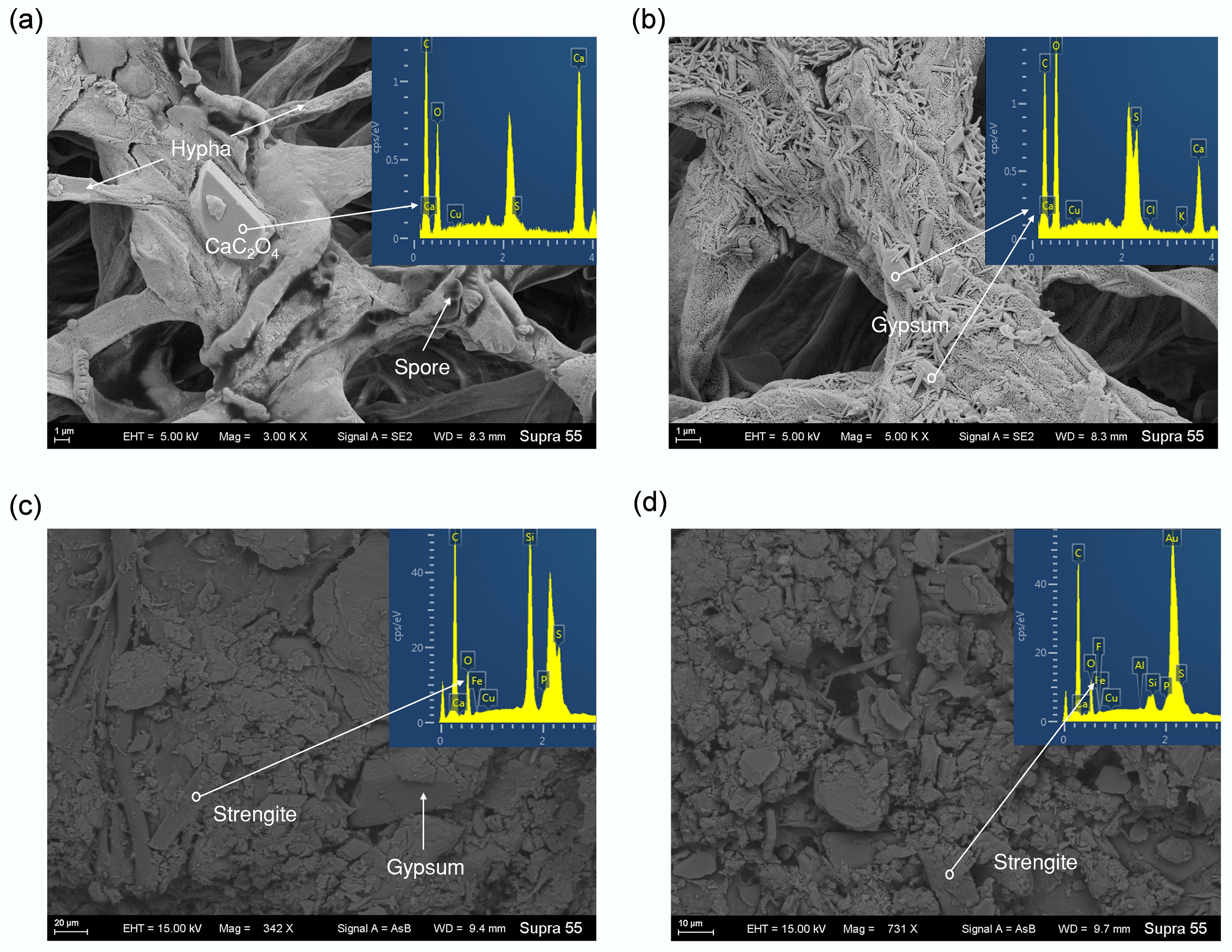 SEM and EDS images of minerals formed during incubation. (a) Calcium oxalate from Low PG treatment. (b) Gypsum particles adsorbed by A. niger hyphae from High PG treatment. (c) and (d) Strengite from Moderate PG treatment.