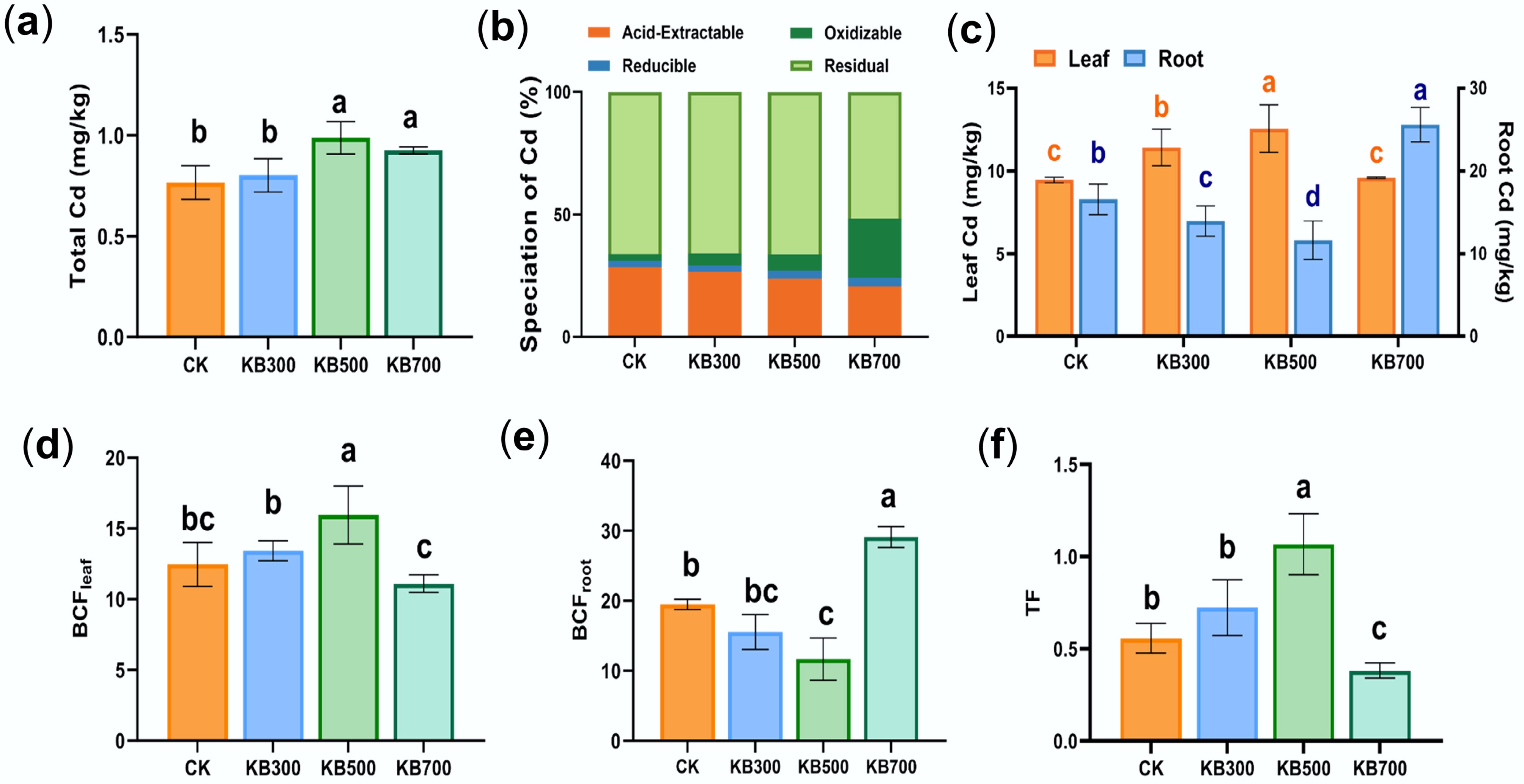 Cd concentration, chemical speciation, and bioconcentration factor (BCF) in soil under biochar treatments. (a) Total Cd concentration in soils under different treatments. (b) The fraction distribution of Cd under each treatment. (c) The concentration of Cd in plant roots and leaves. (d) The bioconcentration factor of Cd in plant leaves. (e) The bioconcentration factor of Cd in plant roots. (f) The translocation factor of Cd from roots to leaves. (CK represents the control group; KB indicates treatments with biochar prepared at different pyrolysis temperatures).