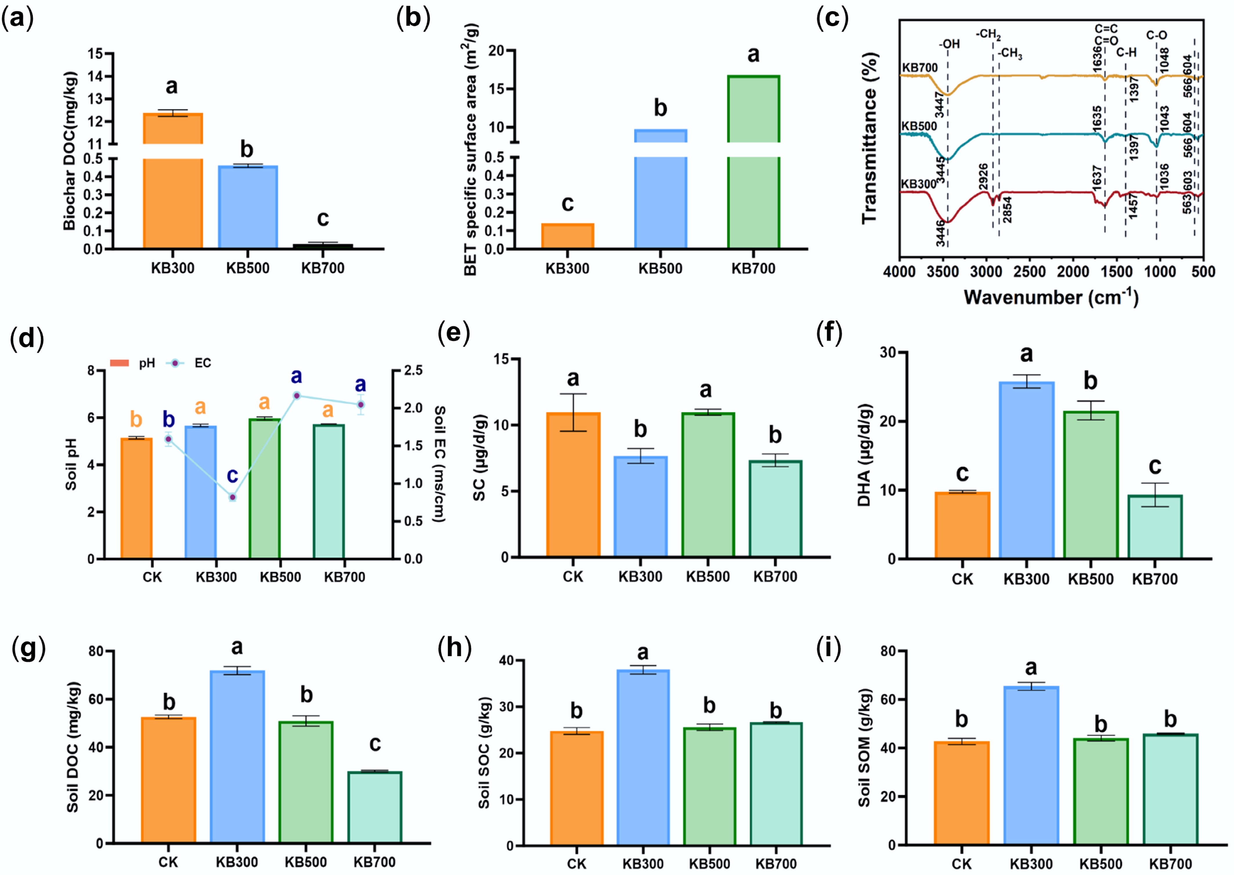 Physicochemical properties of biochars prepared at different pyrolysis temperatures and their effects on soil properties and enzyme activities. (a) DOC content of biochar pyrolyzed at 300, 500, and 700 °C. (b) BET of biochar at different pyrolysis temperatures. (c) FTIR spectra of biochar prepared at different temperatures. (d) Soil pH and EC under different treatments. (e) Soil sucrase (SC) activity under different treatments. (f) DHA activity under different treatments. (g) Soil DOC content. (h) SOC content under different treatments. (i) SOM content under different treatments.
