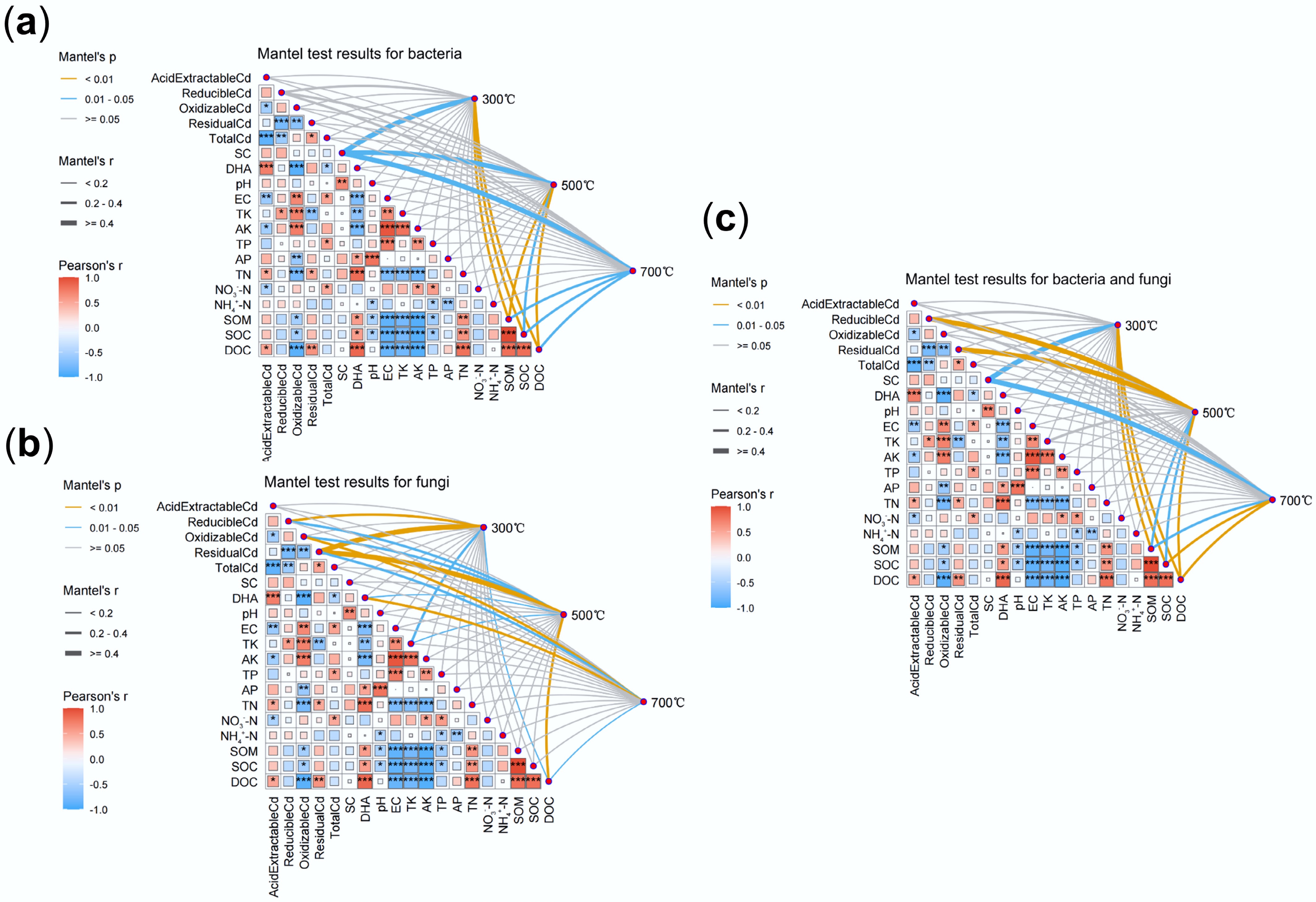 Mantel test analysis of microbial communities in soils with treatments of biochars prepared at different pyrolysis temperatures. (a) Bacterial communities. (b) Fungal communities. (c) Overall test for bacterial and fungal communities.