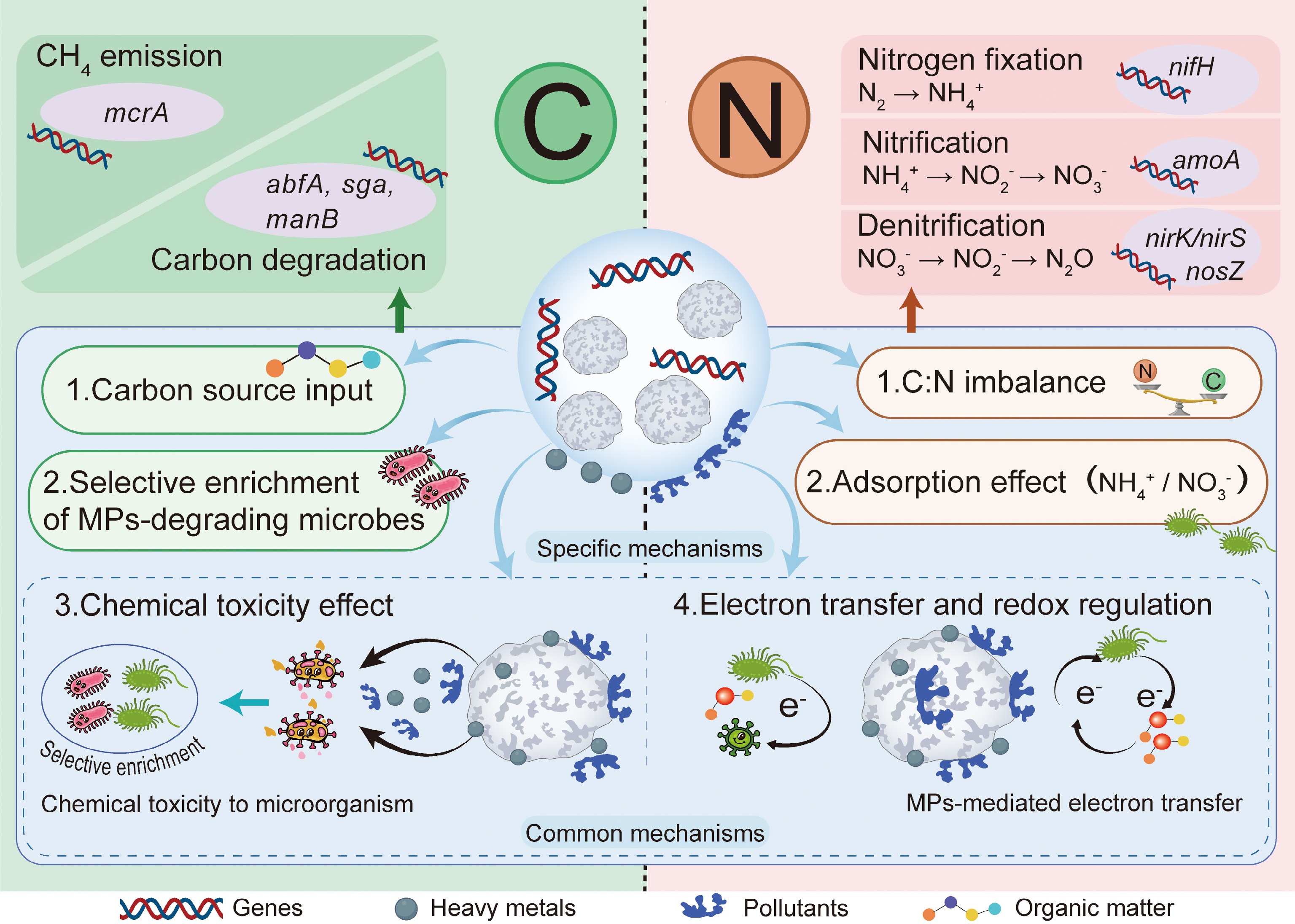 Microplastics affect soil carbon and nitrogen cycling and related gene expression through multiple pathways. In the carbon cycle, MPs serve as an exogenous carbon input (1) and selectively enrich microbial communities capable of degrading MPs (2). These changes alter the abundance of functional genes involved in carbon metabolism, such as those for carbon degradation (abfA, sga, manB) and methane emission (mcrA), collectively influencing carbon turnover and methane release. In the nitrogen cycle, the carbon input disrupts the soil C:N balance (1), while MP surfaces adsorb ammonium ions (2). These processes jointly alter nitrogen availability and regulate the expression of genes associated with nitrogen fixation (nifH), nitrification (amoA), and denitrification (nirS, nirK, nosZ). Furthermore, MPs selectively shape microbial communities by adsorbing heavy metals and organic pollutants (3), and mediate electron transfer and redox reactions (4). Together, these mechanisms reshape microbial metabolic activity and the expression of genes related to carbon and nitrogen transformations.