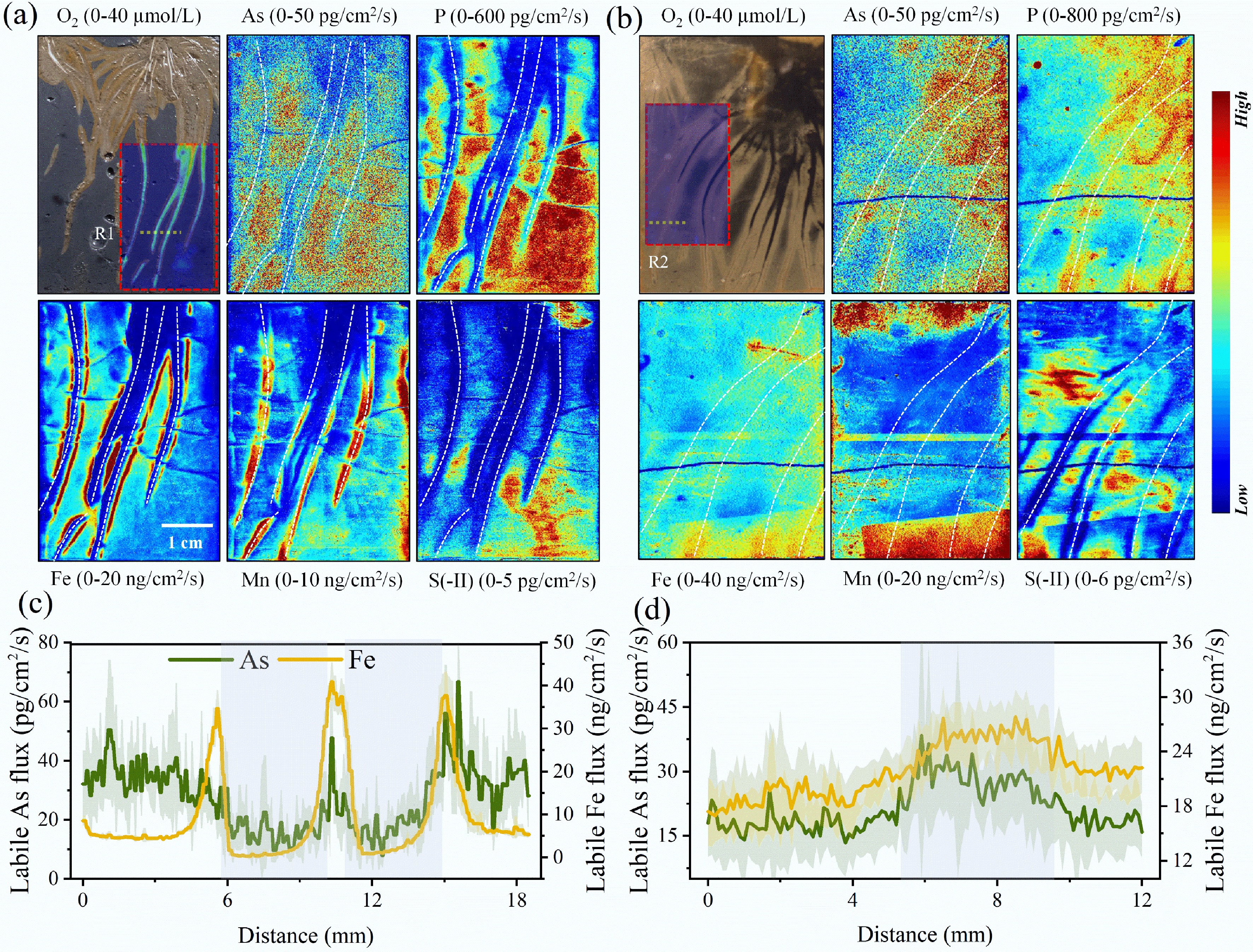 High-resolution imaging of O2, As, and other relevant elements in sediments Two-dimensional distribution of O2 and labile fluxes of As, P, Fe, Mn, and S(-II) in the (a) rhizosphere, and (b) detritusphere. The white dotted lines represent the position of the roots. One-dimensional distribution of labile fluxes of As and Fe in the (c) rhizosphere (R1), and (d) detritusphere (R2), grey areas indicate rhizosphere or detritusphere.
