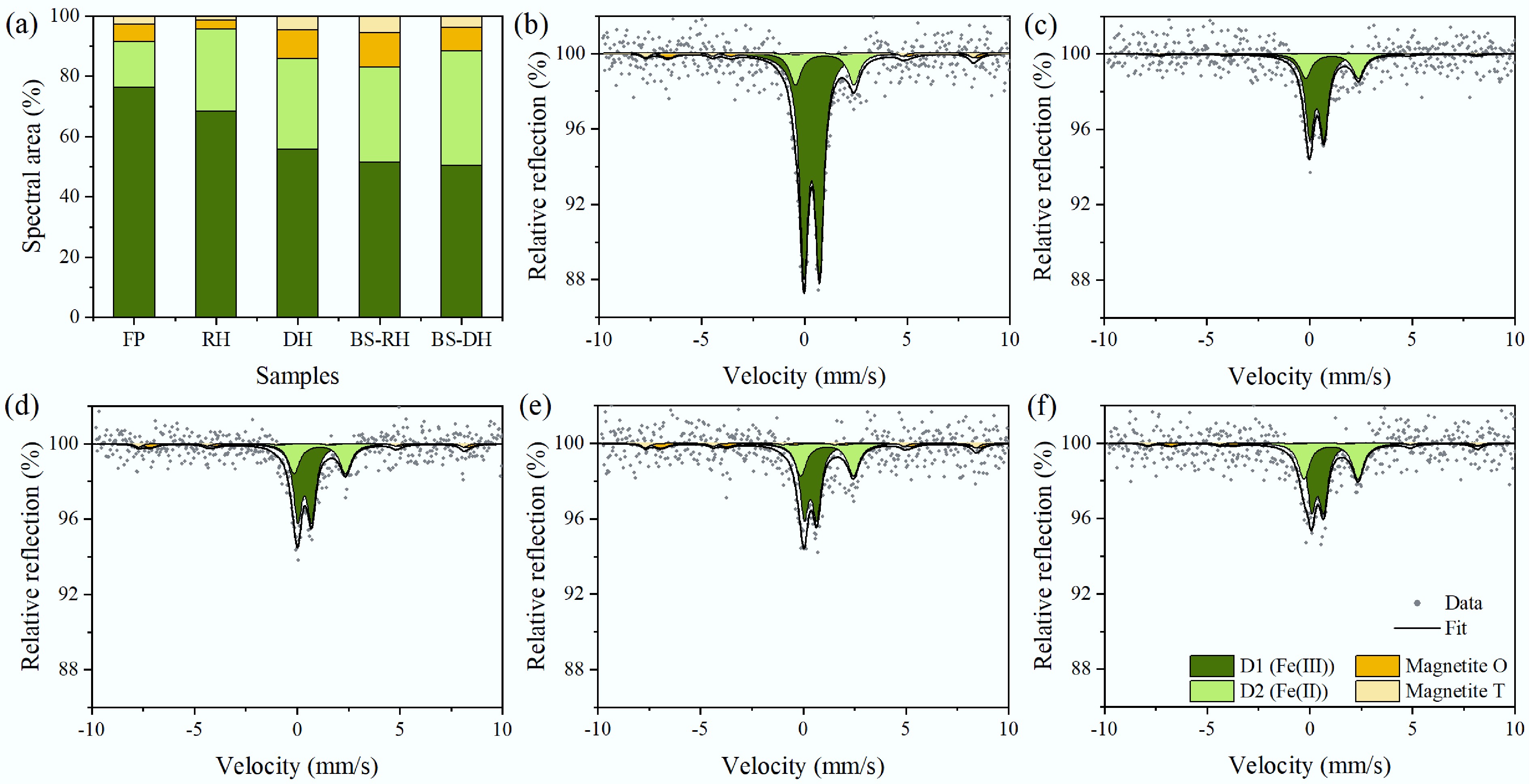 (a) Fe phase fractions, and (b) corresponding Mössbauer spectra of Fe plaque (FP), (c) rhizosphere (RH), (d) detritusphere (DH), (e) bulk sediments during macrophytes growth (BS-RH), and (f) bulk sediments during macrophytes death (BS-DH).