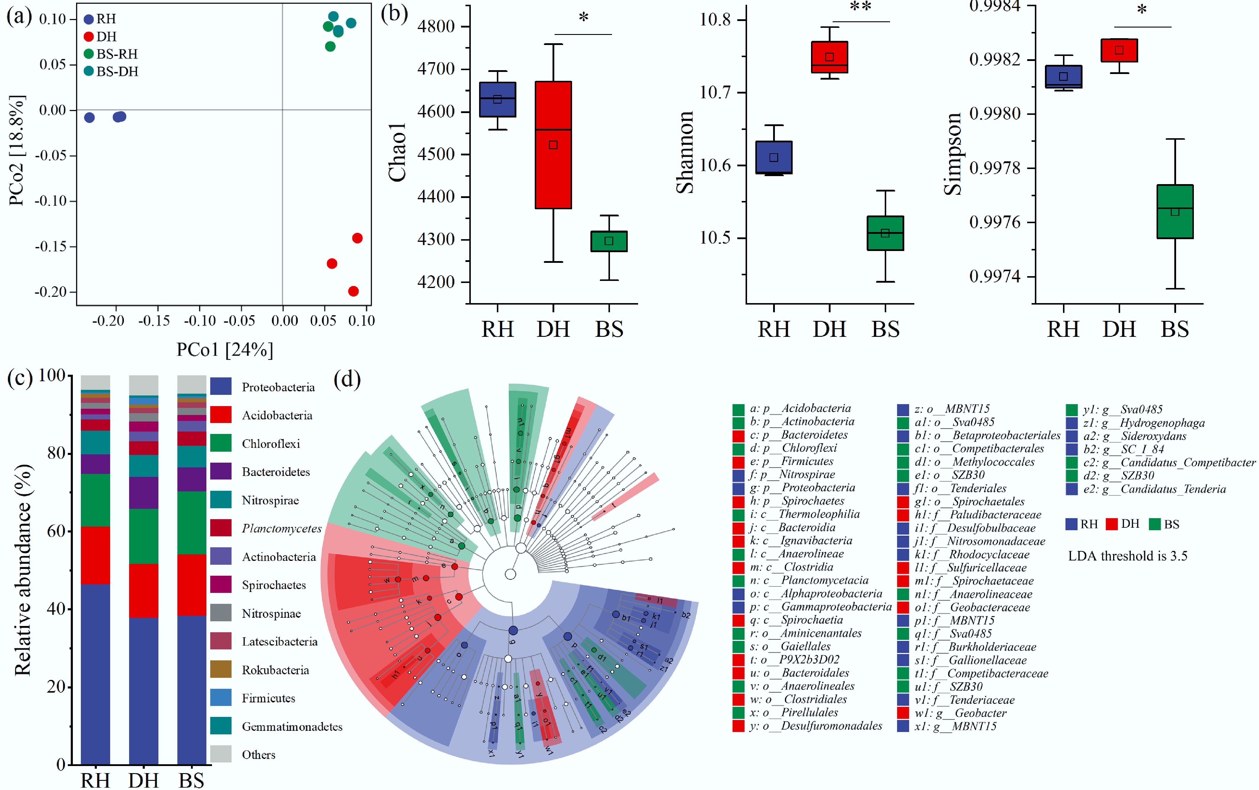 Microbial diversity and community structures in the rhizosphere (RH), detritusphere (DH), and bulk sediment (BS). (a) Composition and structure differences of microbial communities using principal coordinate analysis (PCoA) based on the Bray-Curtis distance, with significant differences analyzed by permutational multivariate analysis of variance (PERMANOVA). (b) α-diversity, including the Chao1, Shannon, and Simpson indexes. (c) Relative abundance of bacterial communities at the phylum level. (d) Bacterial relationships among taxonomic units of microbiota, ranging from the phylum level down to the genus level. Significant differences at * p < 0.05, and ** p < 0.01.