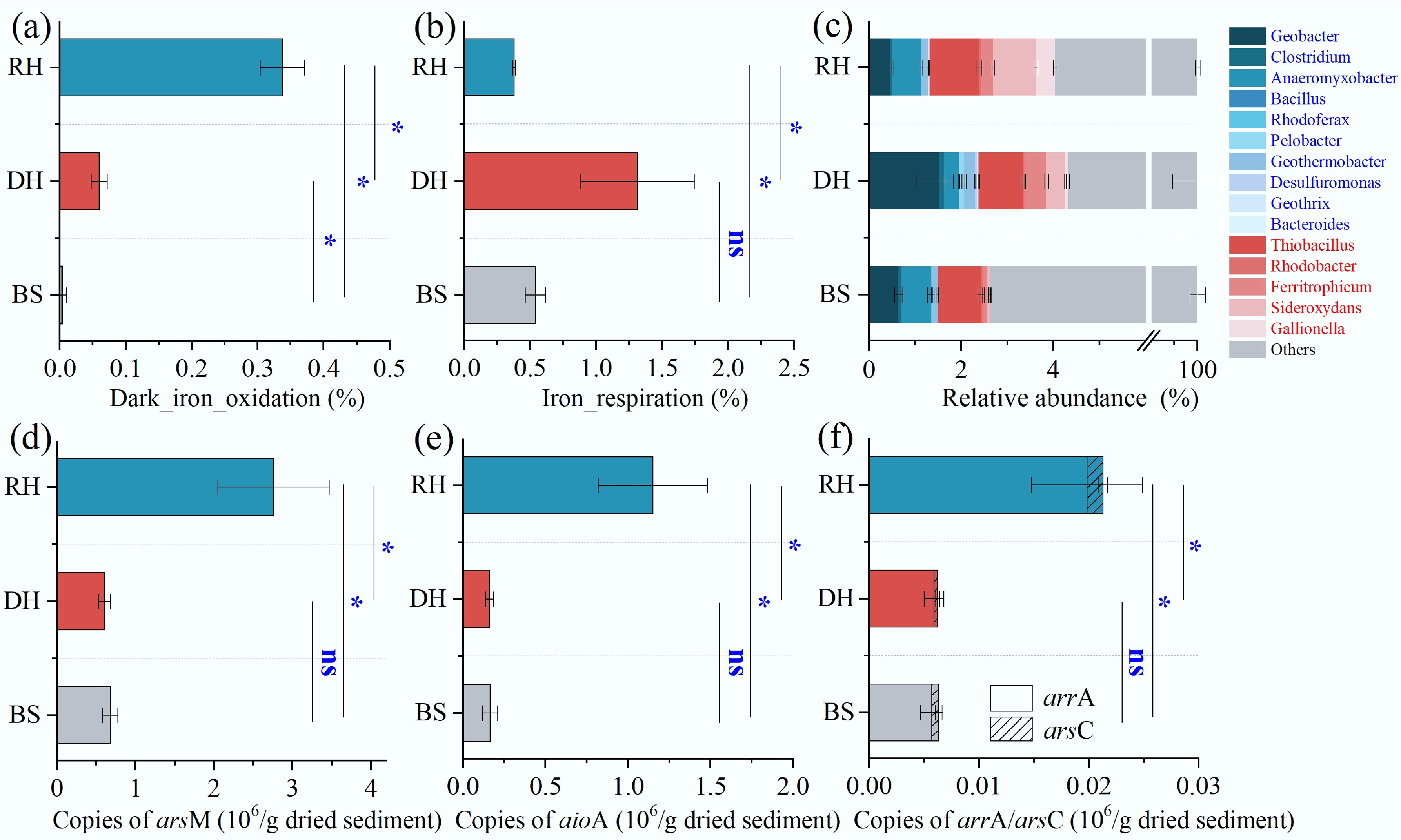 Relative 16S rRNA (gene) abundance of Fe-cycling microbial communities and absolute quantification of As biotransformation genes in the rhizosphere (RH), detritusphere (DH), and bulk sediment (BS). (a) Dark_iron_oxidation function. (b) Iron_respiration function. (c) Relative abundance of typical Fe-reducing (bule text), and Fe-oxidizing (red text) bacteria. (d)–(f) Abundance of the arsM, aioA, arrA, and arsC, respectively. Significance levels at * p < 0.05; ns, not significant.