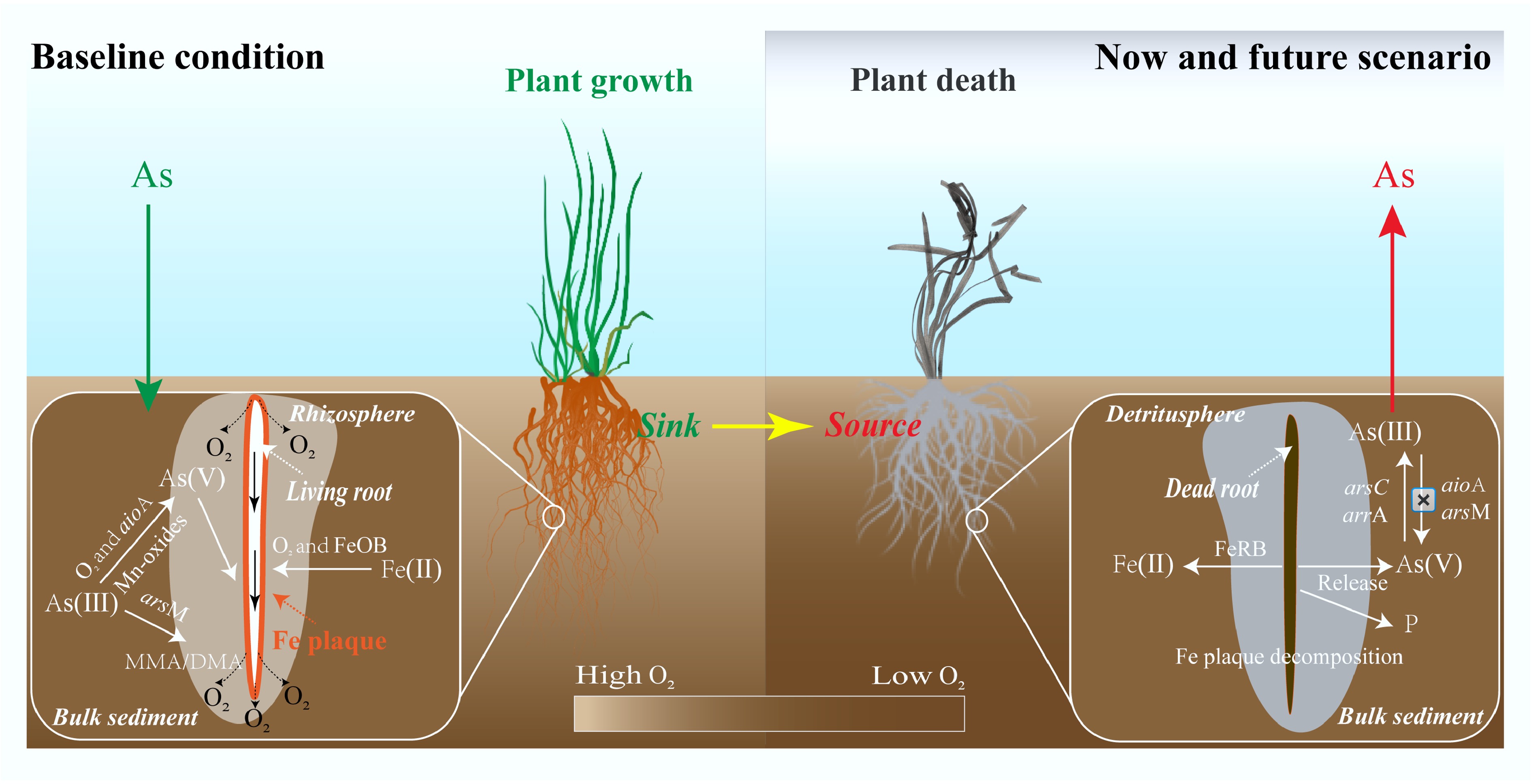 There has been a substantial decline in submerged macrophytes over the last 40 years, due to human activities and climate change[15,16]. After the death of macrophytes, however, the sediment characteristics are reshaped around the decaying roots[17], which may reverse the rhizosphere sequester mechanism from an accumulation zone to a release hotspot, and thereby become a source of aqueous As contamination. Decaying roots cannot release O2, meaning the subsequent cessation of ROL causes a shift in condition from an aerobic rhizosphere to an anaerobic detritusphere[18]. The reductive dissolution of low crystalline Fe-oxides in the Fe plaque under O2 limitation may be enhanced[19], potentially resulting in the rapid release of As into the porewater[20]. Furthermore, the transition from the rhizosphere to the detritusphere initiates a succession of microbial communities, from those that utilize root exudates for energy to those that specialize in decomposing more refractory organic litter[21]. These changes in microbes could significantly alter As biotransformation processes, thereby influencing its speciation and mobility. For example, As(V)-reducing microbes encoding respiratory As(V) reductase genes (arrA) could reduce As(V) to gain energy under anaerobic conditions[14], further increasing the As mobility. Despite the high risk of As release during the apoptosis of macrophytes, the transformations of Fe and As, and their implications for As mobilization are not well understood, particularly in the context of the global decline in macrophytes[22].