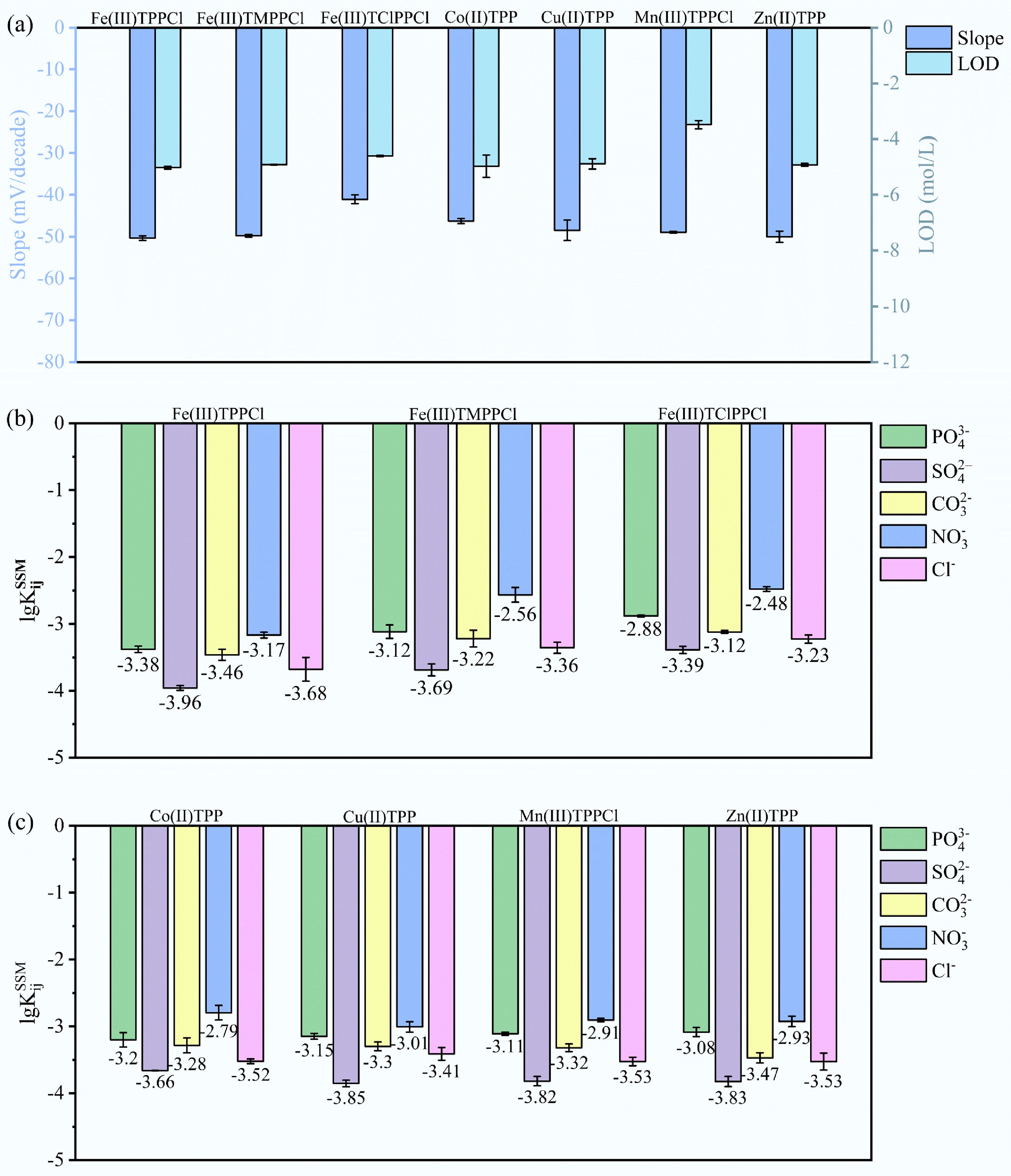 Response slopes, detection limits, and selectivity coefficients for porphyrin-based ionophores. (a) Response slopes (left axis) and detection limits (right axis). (b) Selectivity coefficients logKijSSM of porphyrin-based ionophores with different substituents. (c) Selectivity coefficients logKijSSM of porphyrin-based ionophores with different coordinated metal ions.