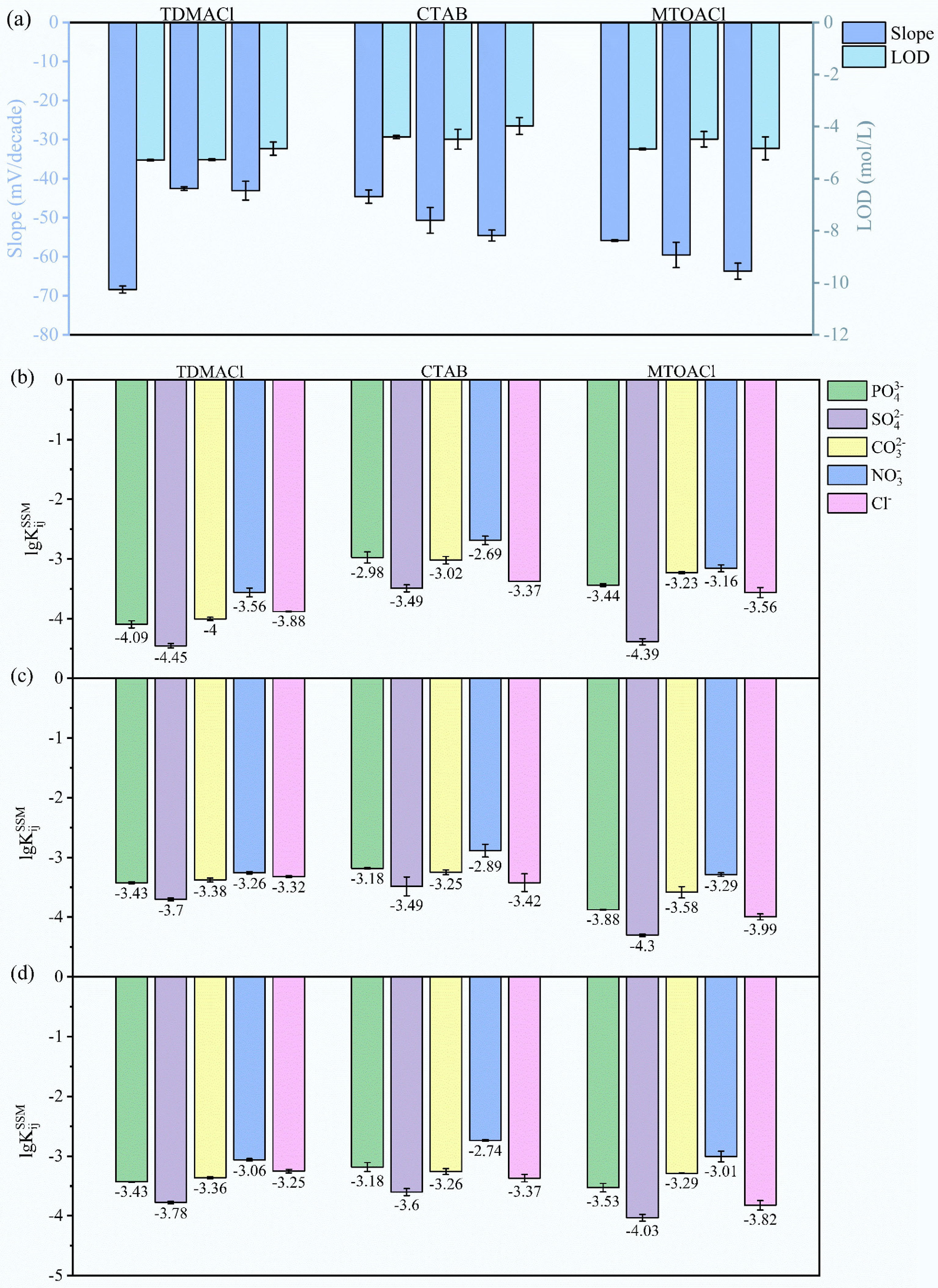 Response slopes, detection limits, and selectivity coefficients for ionic additives at varying additive-to-ionophore ratios. (a) Response slopes (left axis) and detection limits (right axis) of various ionic additives at 1:2, 1:1, 2:1 additive-to-ionophore ratios. (b) Selectivity coefficients logKijSSM of ionic additives at a 1:2 additive-to-ionophore ratio against various interfering ions. (c) Selectivity coefficients logKijSSM of ionic additives at a 1:1 additive-to-ionophore ratio against various interfering ions. (d) Selectivity coefficients logKijSSM of ionic additives at a 2:1 additive-to-ionophore ratio against various interfering ions.