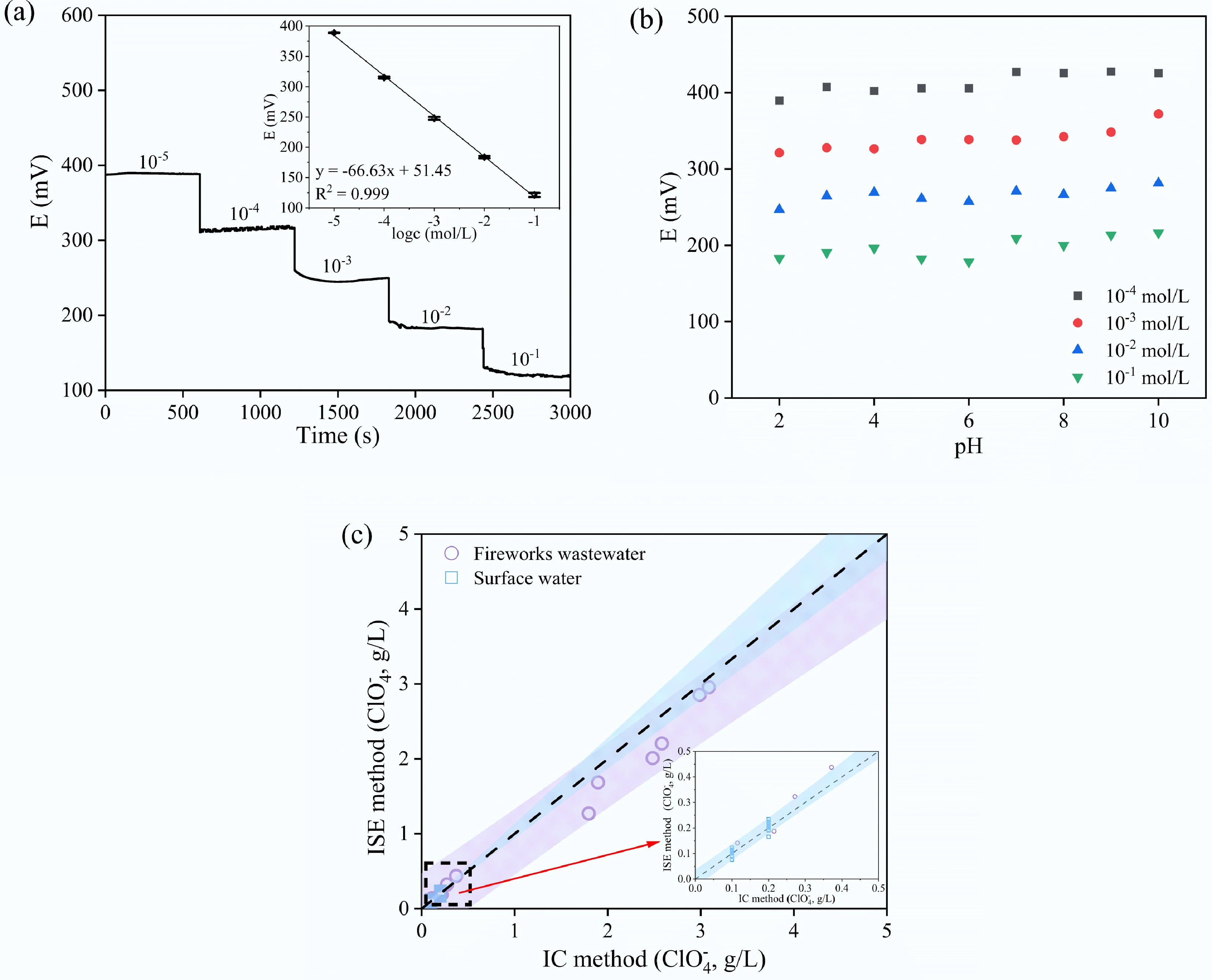 To validate its practical applicability, the optimized ISE was employed to quantify ClO4− concentrations in 15 surface water and five firework manufacturing wastewater samples, which were further spiked with 100 and 200 mg·L−1 ClO4−, respectively. As summarized in Supplementary Table S8, the original ClO4− concentrations in surface water samples were negligible, and the recovery rates were in the range of 75.9%–123.1% with an average value of 104.3%; while the original ClO4− concentrations fireworks manufacturing wastewater samples were 14.8, 171.8, 1,695.2, 2,381.9, and 2,886.5 mg·L−1, respectively, and the recovery rates ranged from 70.8% to 122.9% with a mean value of 96.4%. As illustrated in Fig. 3c, a strong correlation was observed between perchlorate concentrations measured by the ion-selective electrode (ISE) method and ion chromatography (IC) in firework wastewater (purple circles) and surface water (blue squares). The shaded regions represent the 95% confidence intervals for each data set, and the inset highlights the low concentration range (0–500 mg·L−1), illustrating good agreement between the two methods across different sample matrices. These findings confirm that the proposed electrode is not only selective and sensitive but also robust for in situ determination of perchlorate in diverse environmental water bodies.