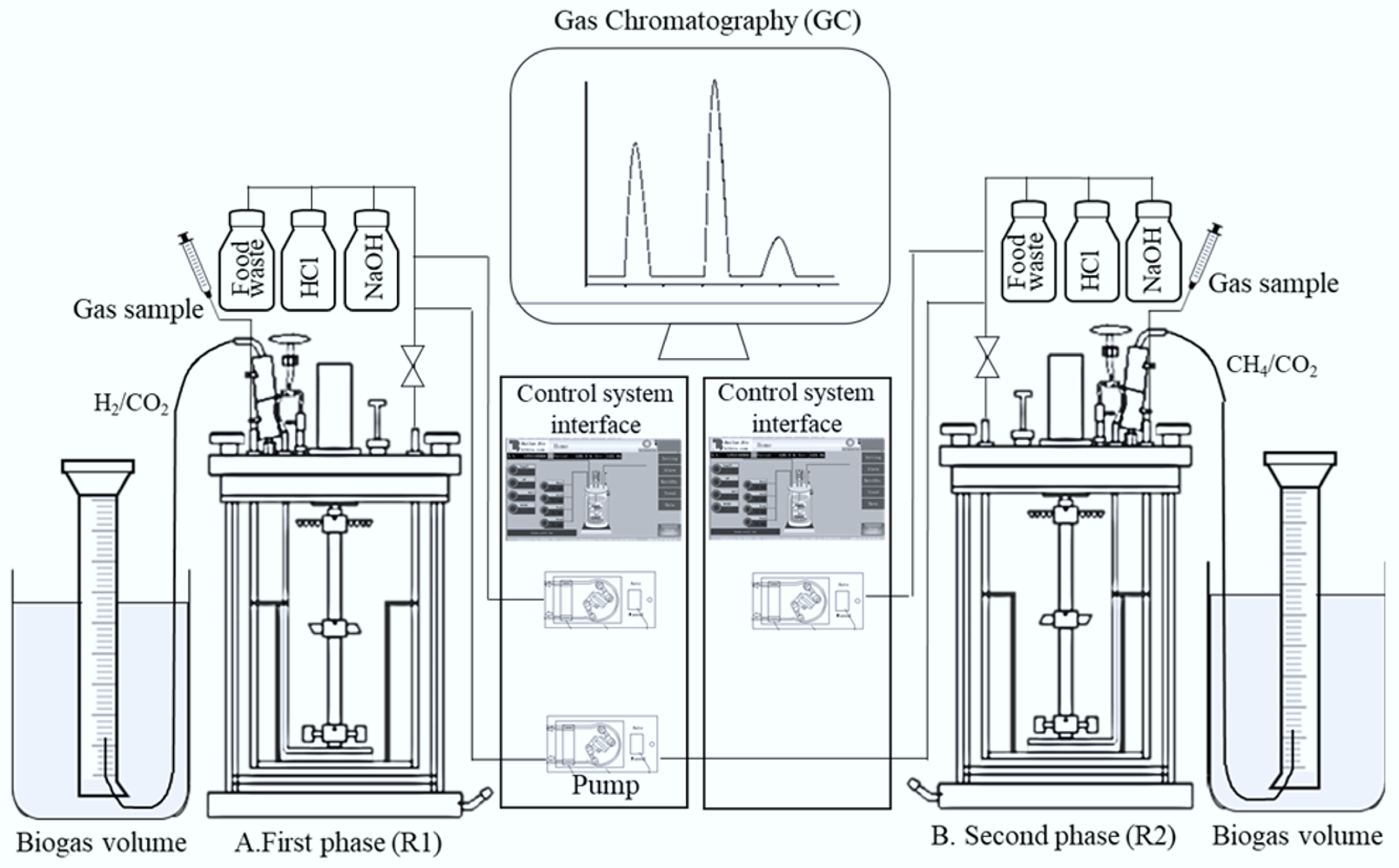 The worldwide generation of food waste by households, restaurants, markets, and food processing industries has become a significant environmental concern due to its large volume, pollution potential, and potential health risks to humans[1,2]. Anaerobic digestion (AD) is a biochemical conversion process occurring without oxygen that effectively treats and utilises food waste to produce biogas[3,4]. Conventional AD usually uses a single-phase digester, but this configuration often suffers from slow conversion rates, limited stability, and high sensitivity to changes in microbial populations and process conditions[5,6]. As a result, biogas produced in single-phase AD tends to have high CO2 content, lower energy density, and less favourable combustion properties, which reduces its value for heat and power generation[7−9]. To overcome these issues, the two-phase anaerobic digestion (TPAD) system was developed. TPAD separates the digestion into two sequential steps: the first producing hydrogen (H2), and the second producing methane (CH4). This division enables each phase to operate under conditions that support specific microbial communities, improving the yields of H2 and CH4 individually.