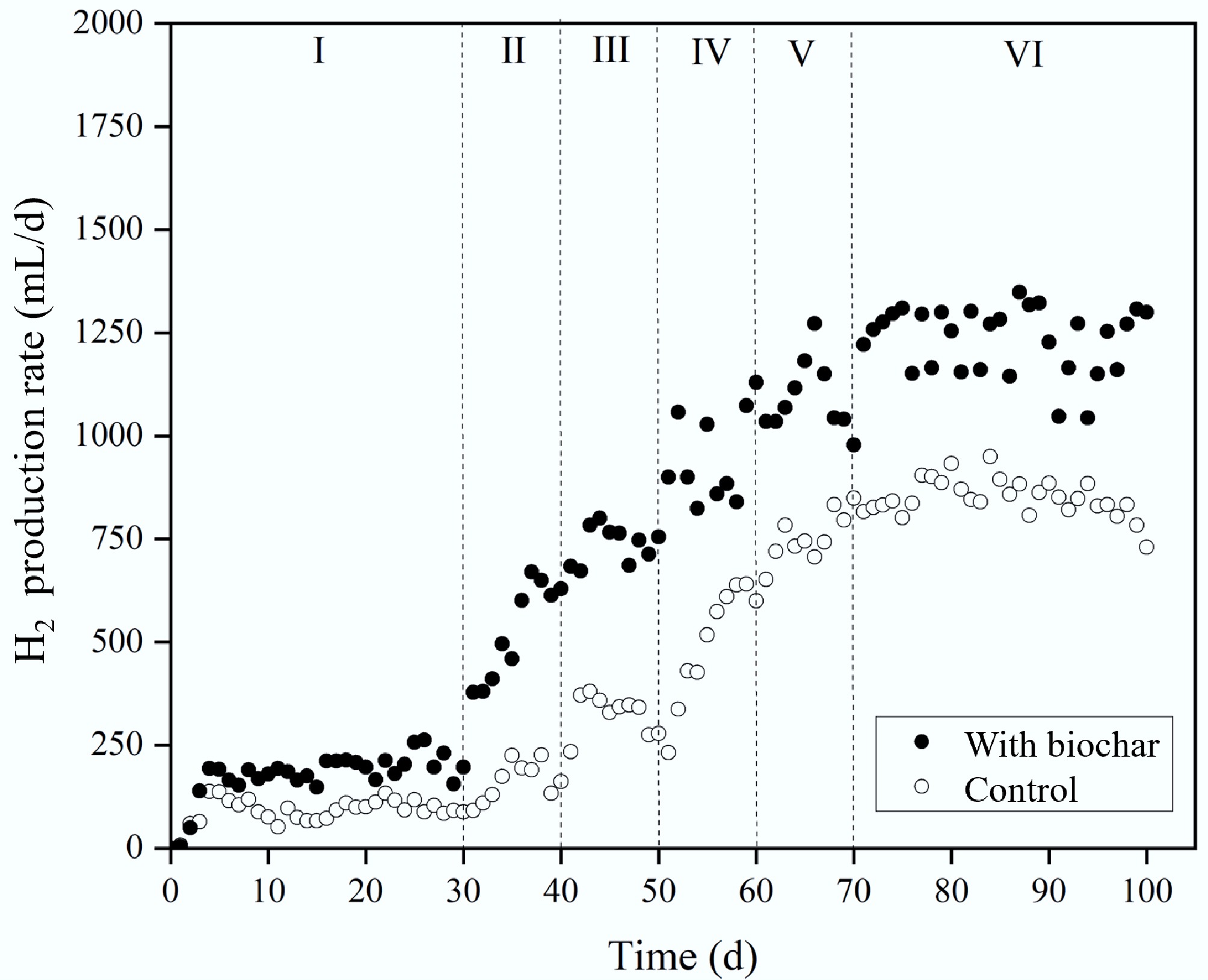 Biochar has emerged as a viable alternative additive for AD, demonstrating significant buffering capacity[15], cost-effectiveness[15], and serving as a sustainable carbon-based material[14,16]. This carbon-rich substance is produced by thermally treating biomass and is characterised by its stable structure, high porosity, and large surface area[2]. In small-scale TPAD experiments, biochar addition has been shown to significantly improve hydrogen and methane generation. The observed increases in gas output are linked to several factors: enhanced buffering of pH fluctuations[17,18], provision of surfaces for microbial attachment[7], stimulation of syntrophic interactions[19], and facilitation of interspecies electron transfer[20]. Our previous work examined biochar's role in boosting H2 and CH4 yields in 100 mL batch reactors[10,11]. Nevertheless, most of the research in this area has centred on bench-scale tests, with limited studies addressing semi-continuous production performance.