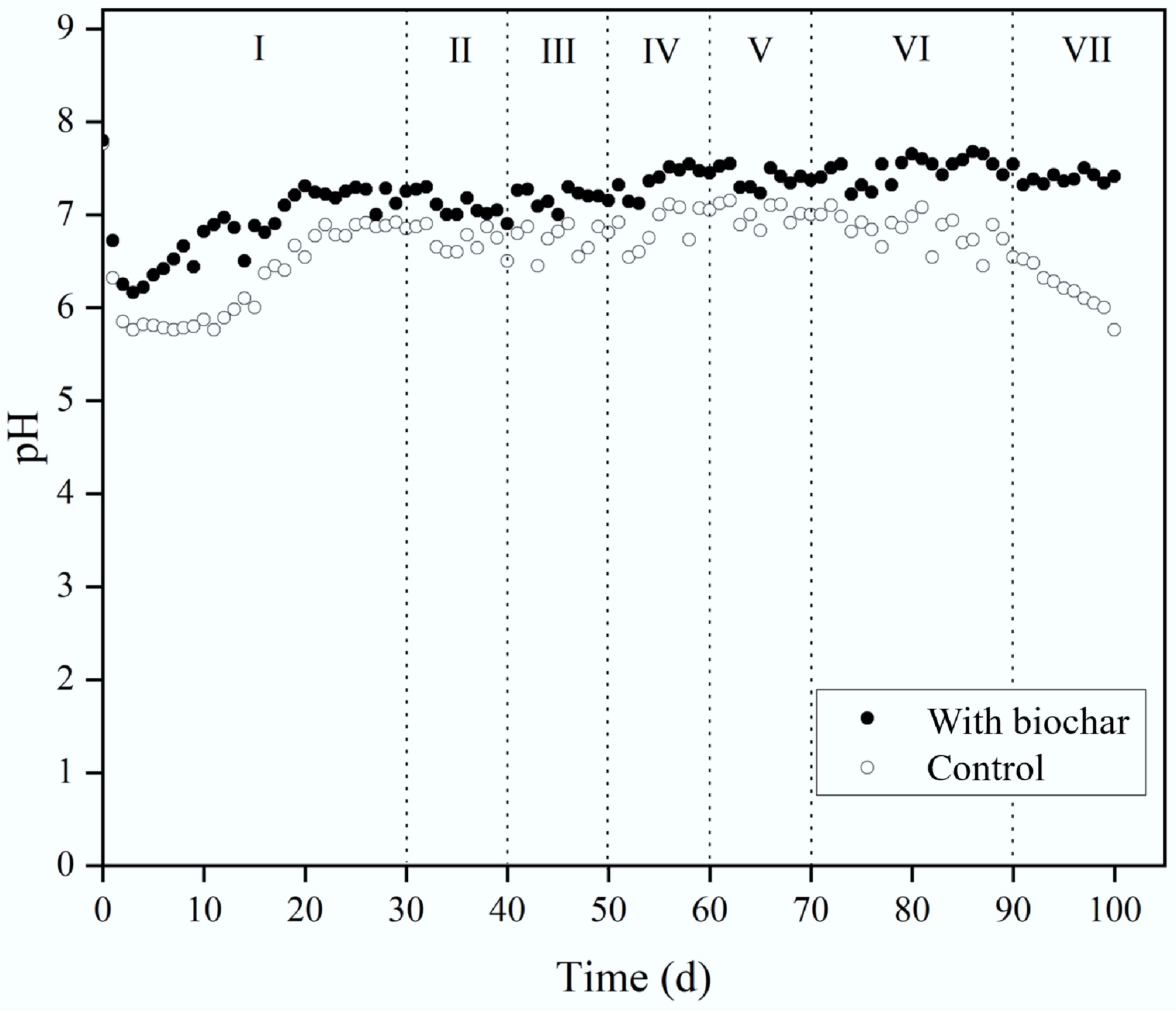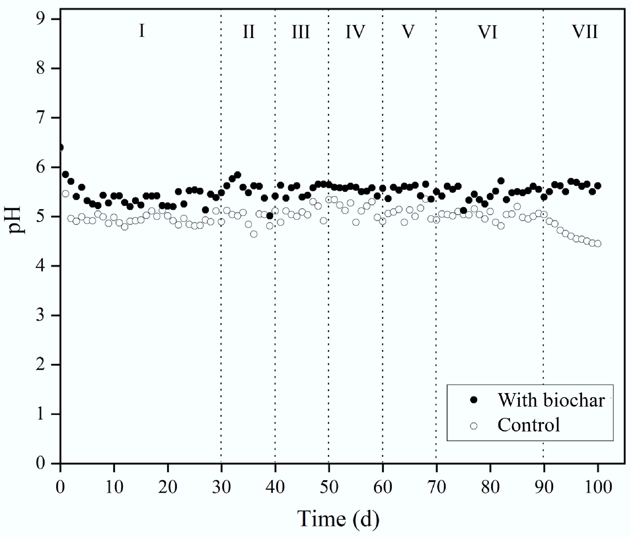 Reactor Stage Gas composition Biogas production rate (L·d) YH (mL/g VS) YM (mL/g VS) pH H2 (%) CH4 (%) CO2 (%) R1 without biochar I 30.26 0.63 69.15 302 92.74 0 4.9 ± 0.1 II 33.61 0.37 66.01 480 81.71 0 5.0 ± 0.3 III 43.76 0 56.23 682 81.40 0 5.1 ± 0.1 IV 47.82 0 51.96 1,116 82.59 0 5.1 ± 0.1 V 49.38 0 50.61 1,488 93.72 0 5.0 ± 0.3 VI 50.44 0 49.55 1,647 107.82 0 5.1 ± 0.2 VII 41.47 0 51.53 1,510 90.96 0 4.8 ± 0.3 R2 without biochar I 14.04 37.71 48.24 147 0 99.97 6.2 ± 0.1 II 0 64.77 35.22 353 0 140.20 6.7 ± 0.2 III 0 74.14 25.86 564 0 152.96 6.8 ± 0.3 IV 0 73.26 26.73 1,062 0 172.71 6.7 ± 0.1 V 0 72.62 27.38 1,736 0 212.69 6.8 ± 0.3 VI 0 74.41 25.58 1,801 0 227.63 6.8 ± 0.1 VII 0 62.13 28.87 1,621 199.71 6.2 ± 0.4 R1 with biochar I 37.37 0.35 61.31 467 138.36 0 5.4 ± 0.1 II 45.17 0 54.82 1158 146.25 0 5.5 ± 0.2 III 50.71 0 49.28 1,462 164.24 0 5.5 ± 0.3 IV 50.14 0 49.85 1,890 168.24 0 5.5 ± 0.1 V 51.58 0 48.41 2,115 176.51 0 5.6 ± 0.1 VI 53.15 0 46.84 2,320 189.73 0 5.6 ± 0.2 VII 52.42 0 47.58 2,329 183.59 0 5.4 ± 0.3 R2 with biochar I 14.51 39.66 47.44 648 0 199.13 6.8 ± 0.1 II 0 74.04 25.96 1,104 0 224.27 7.1 ± 0.2 III 0 76.36 23.63 1,654 0 312.48 7.2 ± 0.1 IV 0 77.63 22.36 1,867 0 315.16 7.3 ± 0.1 V 0 80.24 19.75 2,215 0 394.54 7.3 ± 0.2 VI 0 81.21 17.24 2,383 0 407.17 7.4 ± 0.2 VII 0 80.65 19.35 2,361 0 374.24 7.3 ± 0.2 The reduction in RH observed in controls, especially during Stage VII, suggests the pH was shifting away from the optimal 5.5–6.5 range. Figure 3 displays pH trends in the first TPAD phase. Initially, all reactors were adjusted to pH 6.4 to favour hydrogen-producing bacteria. During Stage I, pH decreased in all reactors as bacterial metabolism generated VFAs. However, the pH in controls dropped more sharply to 4.9 compared to 5.2 in biochar-treated reactors. Between Stages II and V, the control pH stabilised near 5.0, while biochar reactors maintained a higher average of 5.5, indicating that biochar buffered pH more effectively and kept conditions closer to the optimal range[23]. Rising OLRs did not significantly impact pH trends. No notable pH differences were detected between Stage VI semi-continuous operation and the earlier stages. In Stage VII, while biochar reactors held steady at pH 5.5, the controls dropped further to 4.5, diverging from the favourable pH for hydrogen bacteria (5.5–6.5). The steady pH in biochar treatments underscores its buffering role[24], likely due to surface functional groups (carboxyl, hydroxyl) and ash content rich in elements (Fe, Ca, K, Mg, Na, Al) that contribute to alkalinity[10,16].