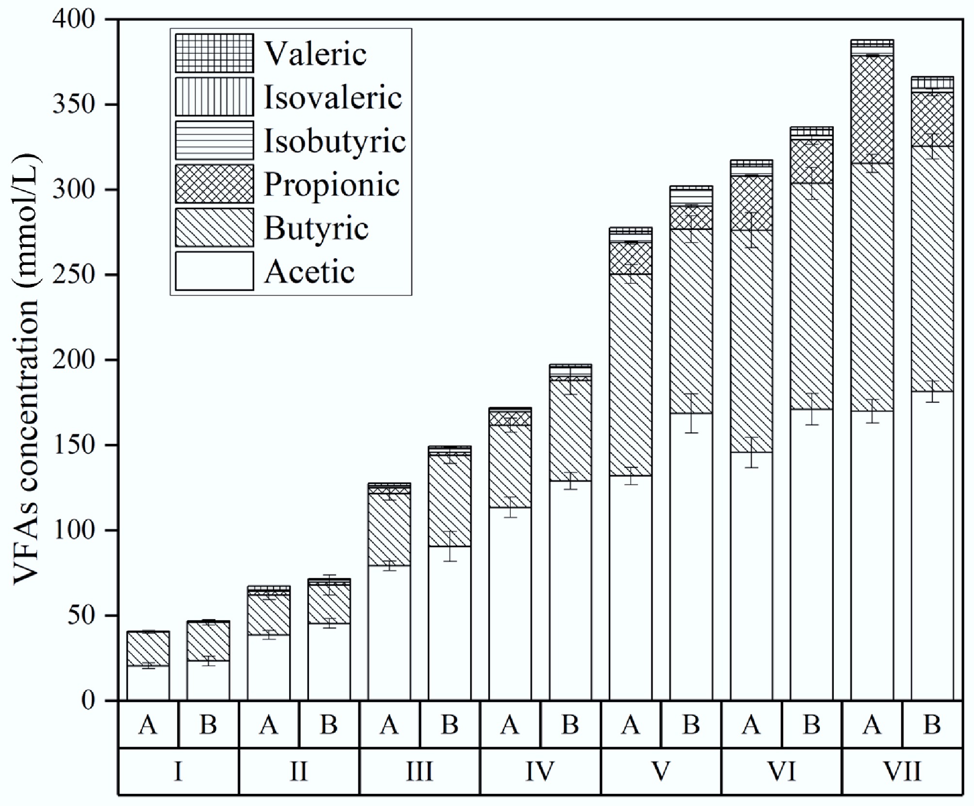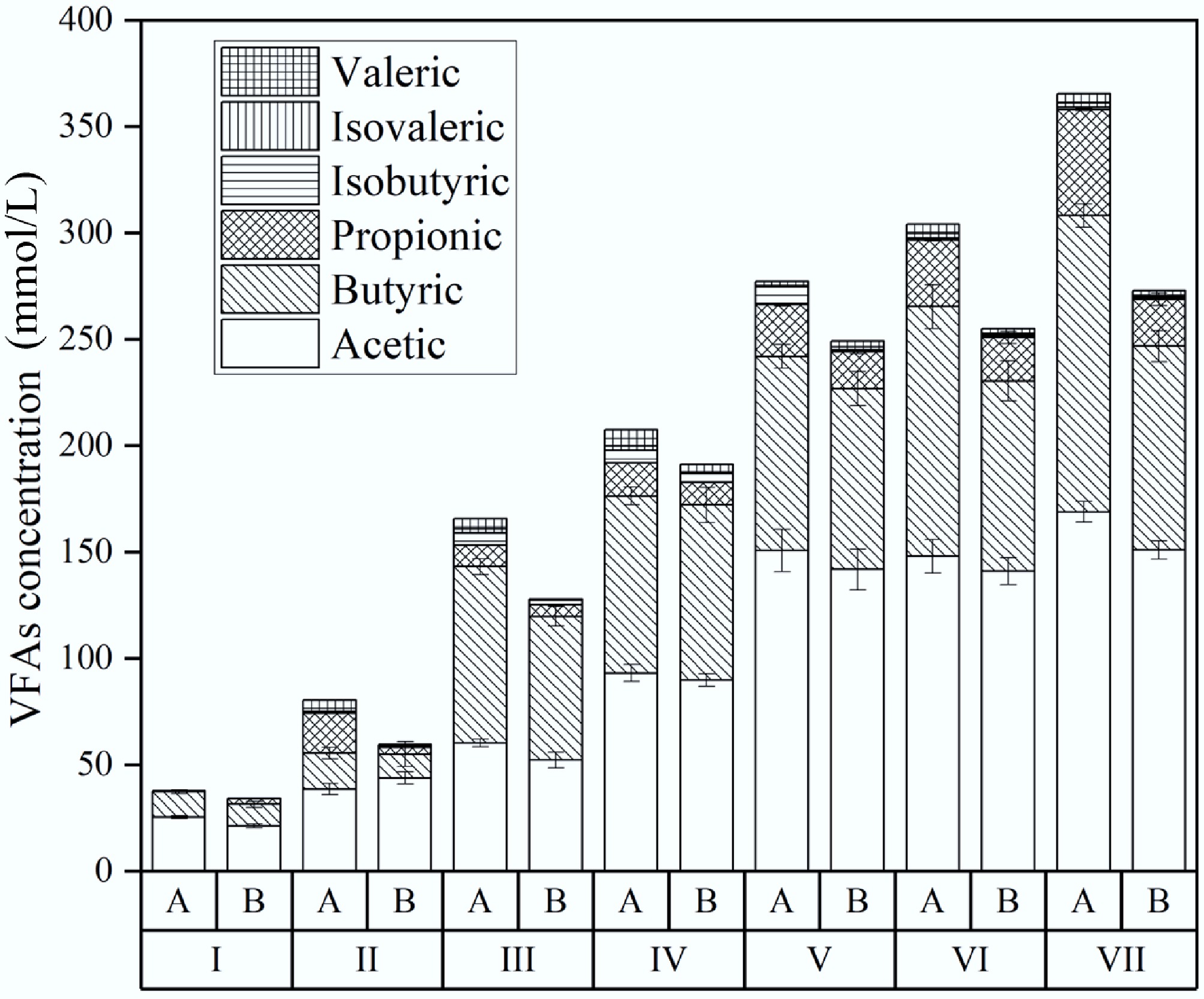 Effect of biochar addition on VFA during H2 production. A is the reactor without biochar, and B is the reactor with biochar addition.