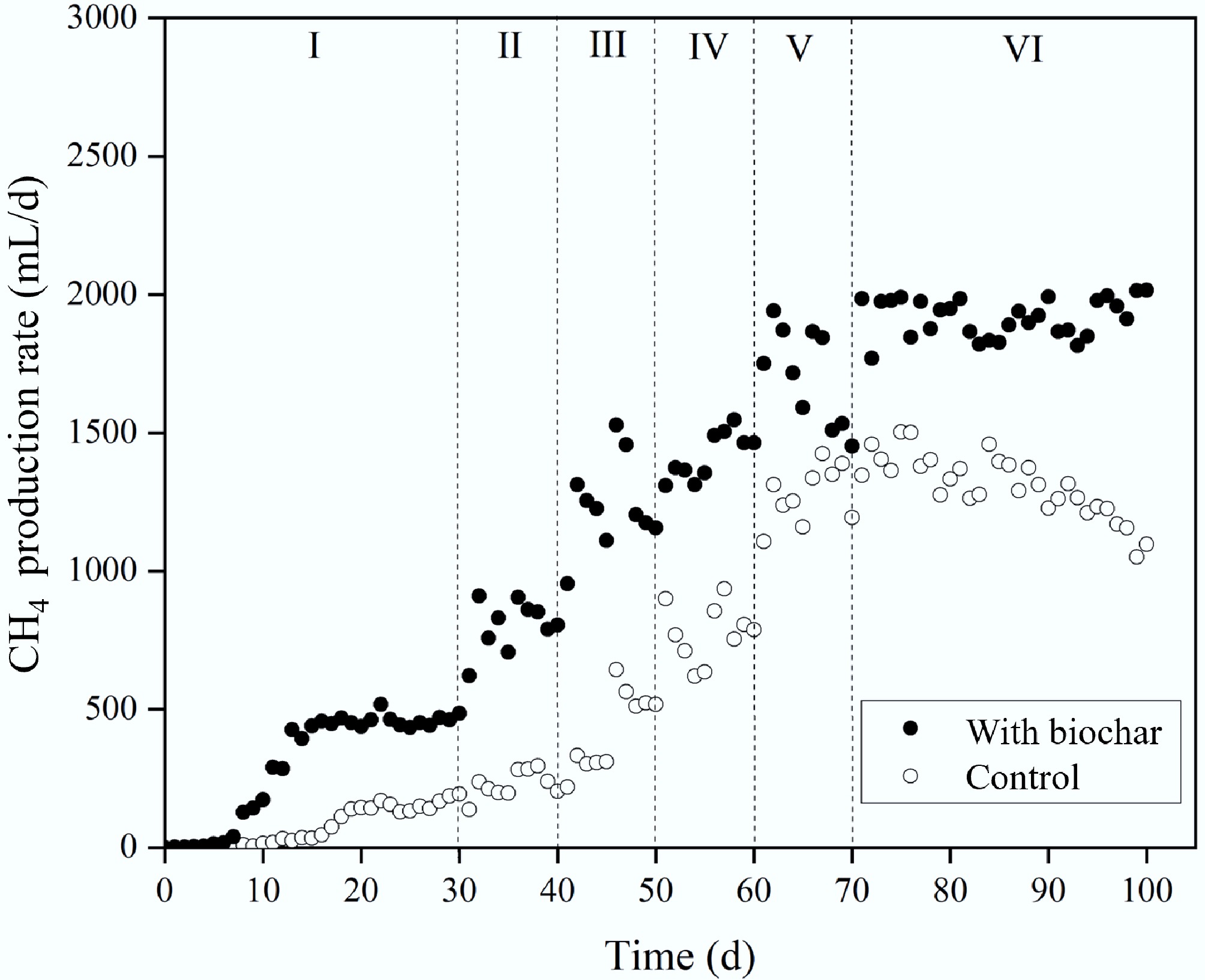 Biochar buffers pH and allows digestion to operate at high organic loading rates.