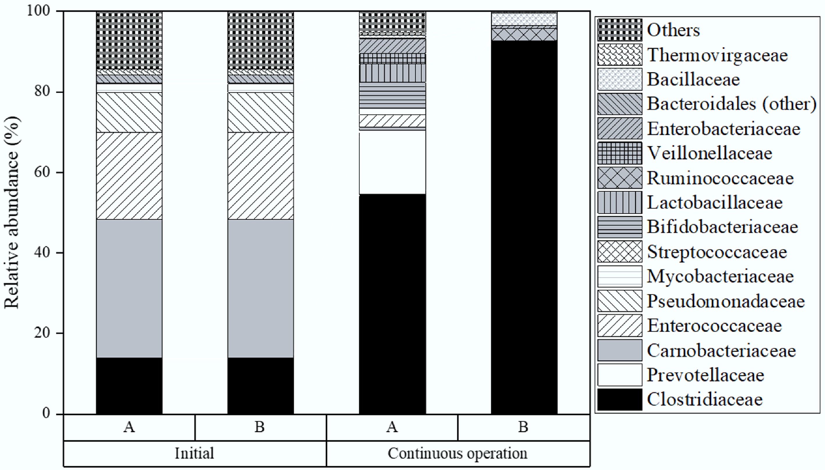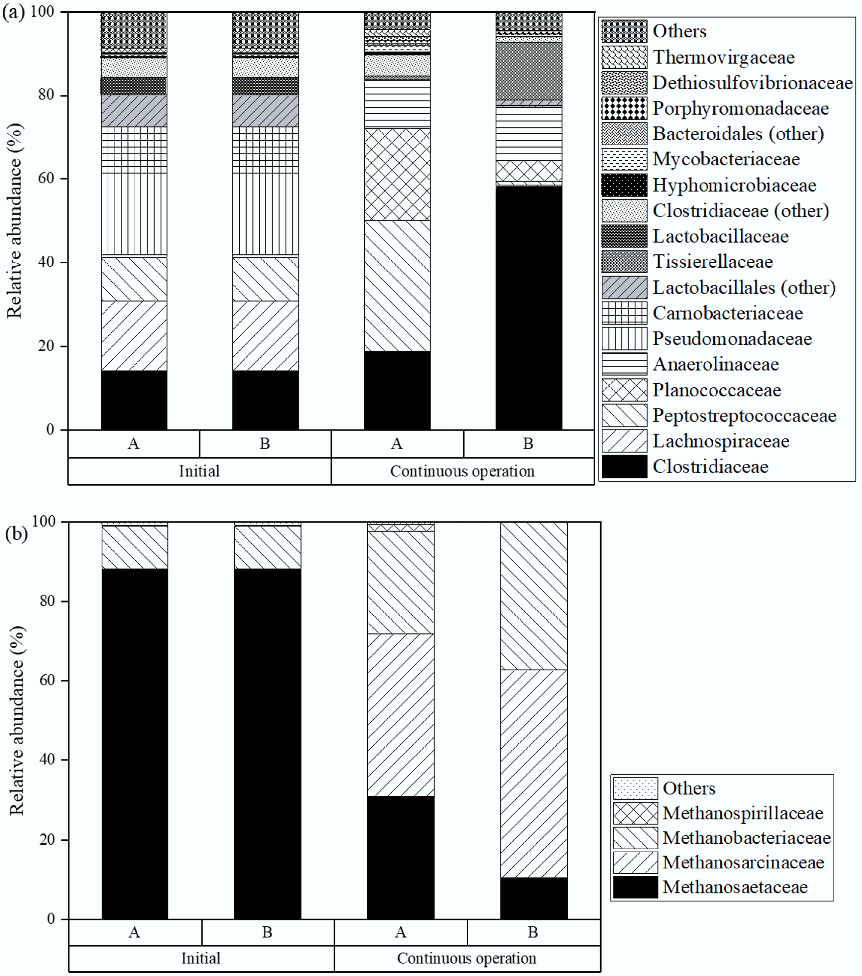 Microbial distribution at the family level in the second phase of TPAD with (a), and without (b) biochar addition during semi-continuous operation.