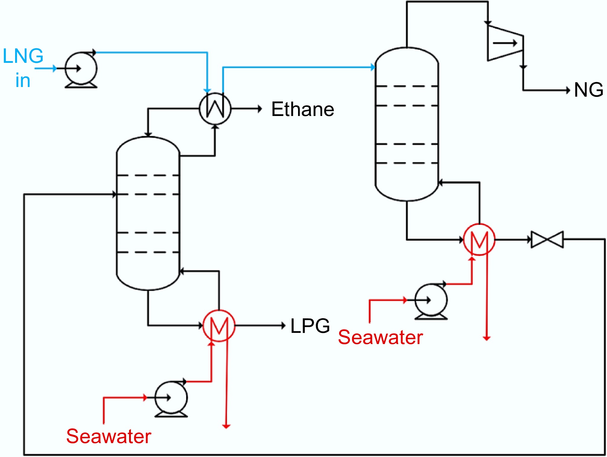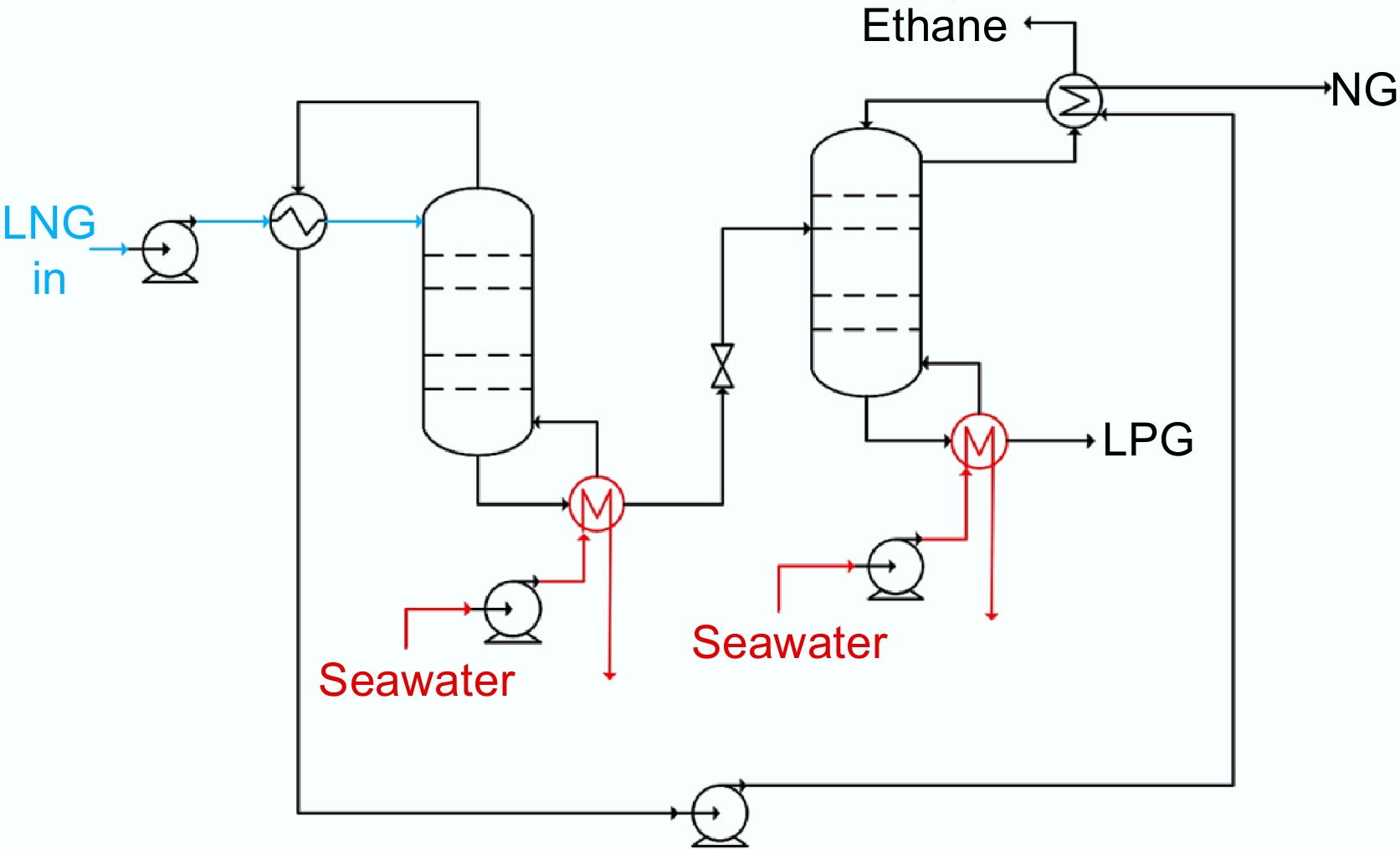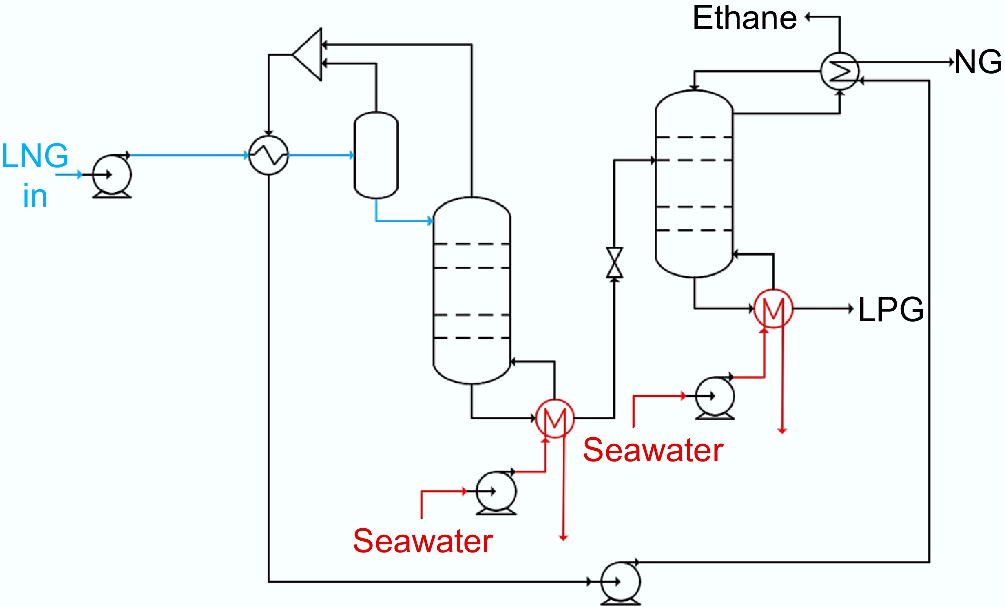 Previous studies have primarily focused on the recovery of higher hydrocarbons using heat sources such as LNG boil-off gas combustion, process water, or industrial waste heat. However, these approaches often require additional infrastructure, high-temperature utilities, or are limited by site-specific heat availability, which restricts their wider application at LNG receiving terminals. In contrast, the present study explores the use of seawater as a sustainable, readily available heat source for both the demethanizer and deethanizer columns. This approach eliminates the need for high-temperature heat utilities and allows direct integration with existing open-rack vaporizer systems commonly used at regasification terminals.