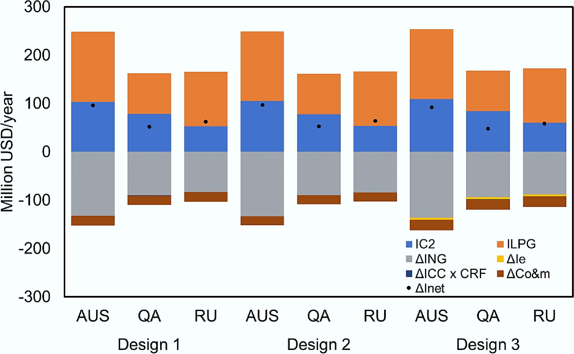 • LNG with different compositions (Table 1) from Australia (North West Shelf), Qatar and Russia (Sakhalin) were simulated, and the results are shown in Fig. 8. It should be noted that the LNG originating from the USA (Alaska) contains less than 1% higher hydrocarbons and cannot be fed into any of the hydrocarbon recovery systems. The simulations assumed that LNG with different compositions was fed to the proposed designs without extra pre-processing or further optimisations. It was evident that since Australian LNG contains the highest ethane and LPG contents, the recovery systems were the most lucrative with it. While Qatar LNG had a lower methane and a higher ethane content than Russian LNG, the latter had a higher LPG content, and therefore, recovering higher hydrocarbons from Russian LNG generated more profits. Design 2 performed the best with all three LNG compositions.