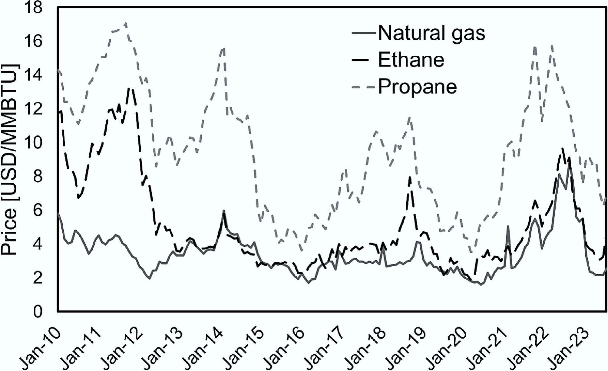 (4) The prices of sale of natural gas, ethane, and LPG are the average values of prices between 2010 and 2023. LPG is assumed to have the same selling price as propane.
