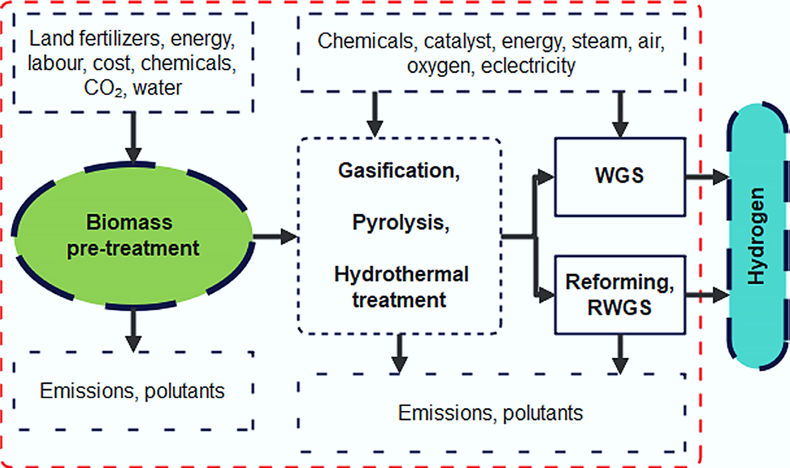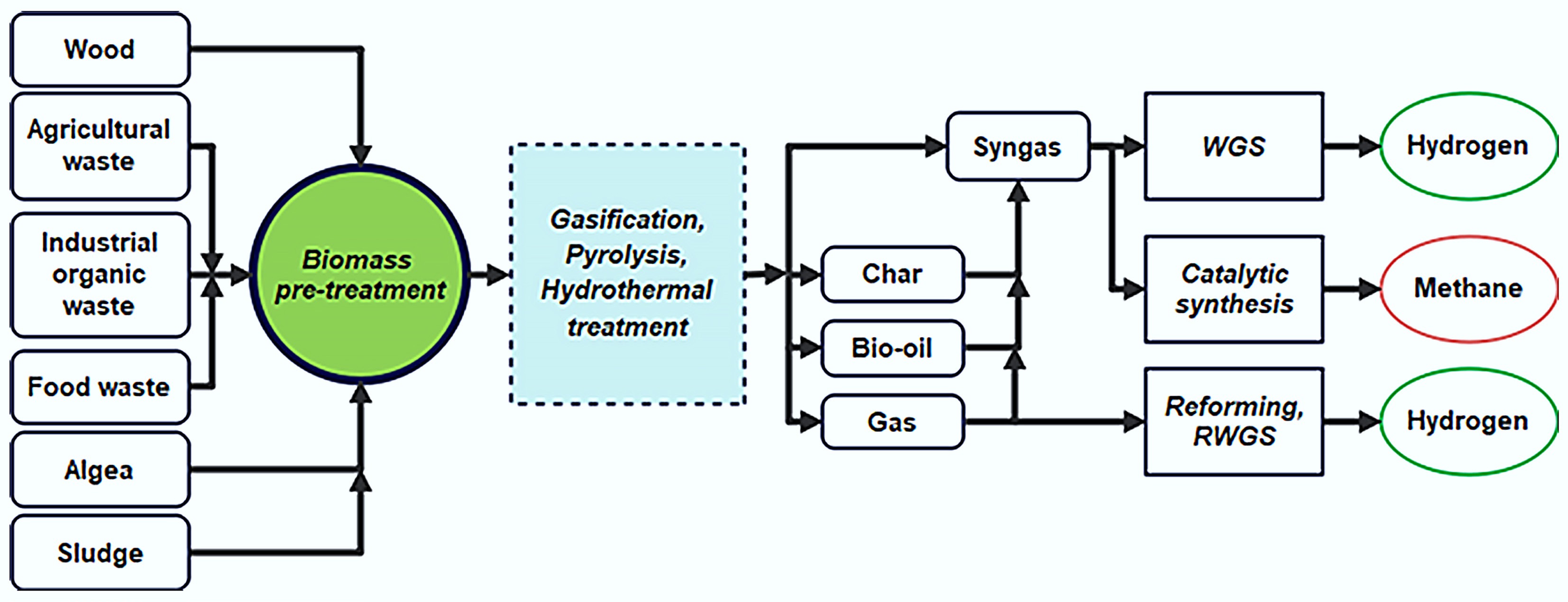 GHG savings depend on substitution (e.g., replacing fossil syngas)Similar; GHG impact determined by end use (fuel, chemical); negative emissions possible with carbon capture and storage (CCS) Grid injection or CNG; methane leakage and efficiency affect net GHG savings Biogenic routes generally yield lower GHG than fossil, but only if methane slip and H2 purification are managed efficiently [72] End-of-life/waste management Ash, char, tar reuse/disposal, water effluents; possible recycling or reuse of byproducts Similar, plus wastes from H2 separation materials Digestate use in agriculture, residual CO2 streams from upgrading H2 and methane pathways introduce separation wastes; all routes can benefit from optimal byproduct valorization [72] Overall GHG and environmental performance (summary) Significant GHG reduction vs fossil syngas, especially when using bio-waste; some trade-offs in land/water use H2 from biomass + CCS can be net negative GHG; LCA depends on full-system boundaries Biomethane can achieve deep decarbonization if methane slip minimized and digestate reused Best LCA results from waste-based feedstocks, strong methane management, CCS integration for negative emissions [72] Syngas, which is H2-rich, is considered one of the cleanest energy sources, producing the fewest GHGs. Several studies have investigated the environmental impact of producing H2-rich syngas from various biomass types[69]. Biomass pyrolysis produces the highest CO2 equivalent emissions among the thermo-catalytic processes for producing H2-rich syngas[70]. Yet, due to variations in machinery, process conditions, and feedstocks, it is impossible to compare the environmental impact of these various processes directly. According to Dufour & Moreno, the CO2 equivalent emissions can be decreased by combining the water-gas-shift reaction with the reforming process[71].