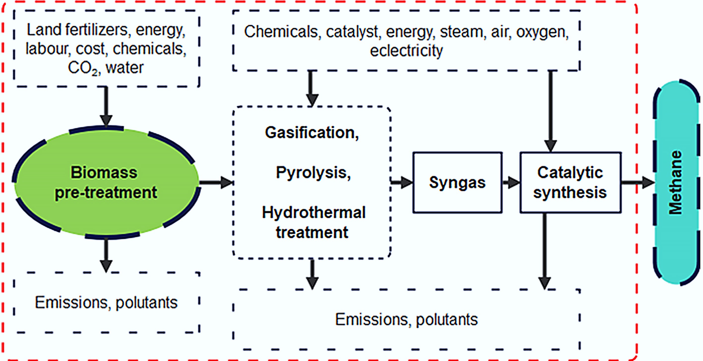 As previously mentioned, multiple steps are involved in utilizing LCA to assess the thermochemical conversion of biomass. These include the production and transportation of feedstocks, the thermochemical conversion process, and the distribution and end-use of the methane once it has been converted. The environmental impacts of these stages can be analyzed by considering factors such as water and energy consumption, carbon emissions, and the release of other pollutants. For example, the production of biomass feedstock may involve the application of pesticides and fertilizers, which can negatively affect ecological balance and water quality. Additionally, CO2 and other GHGs are released during both the feedstock processing and methane production phases, further influencing the overall carbon footprint of biomethane.