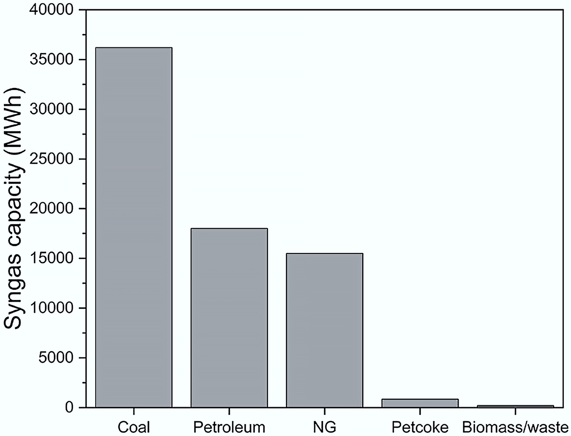 Various biomass feedstocks, including wood, agricultural residues, municipal solid waste (MSW), and energy crops like switchgrass or miscanthus, can be utilized for syngas production. Before gasification, biomass is typically dried and ground into small particles. The syngas production capacities of different feedstocks are illustrated in Fig. 2[7]. As shown, coal exhibits the highest syngas production capacity, exceeding 35,000 MWh, whereas petcoke and biomass/waste yield the lowest amounts.