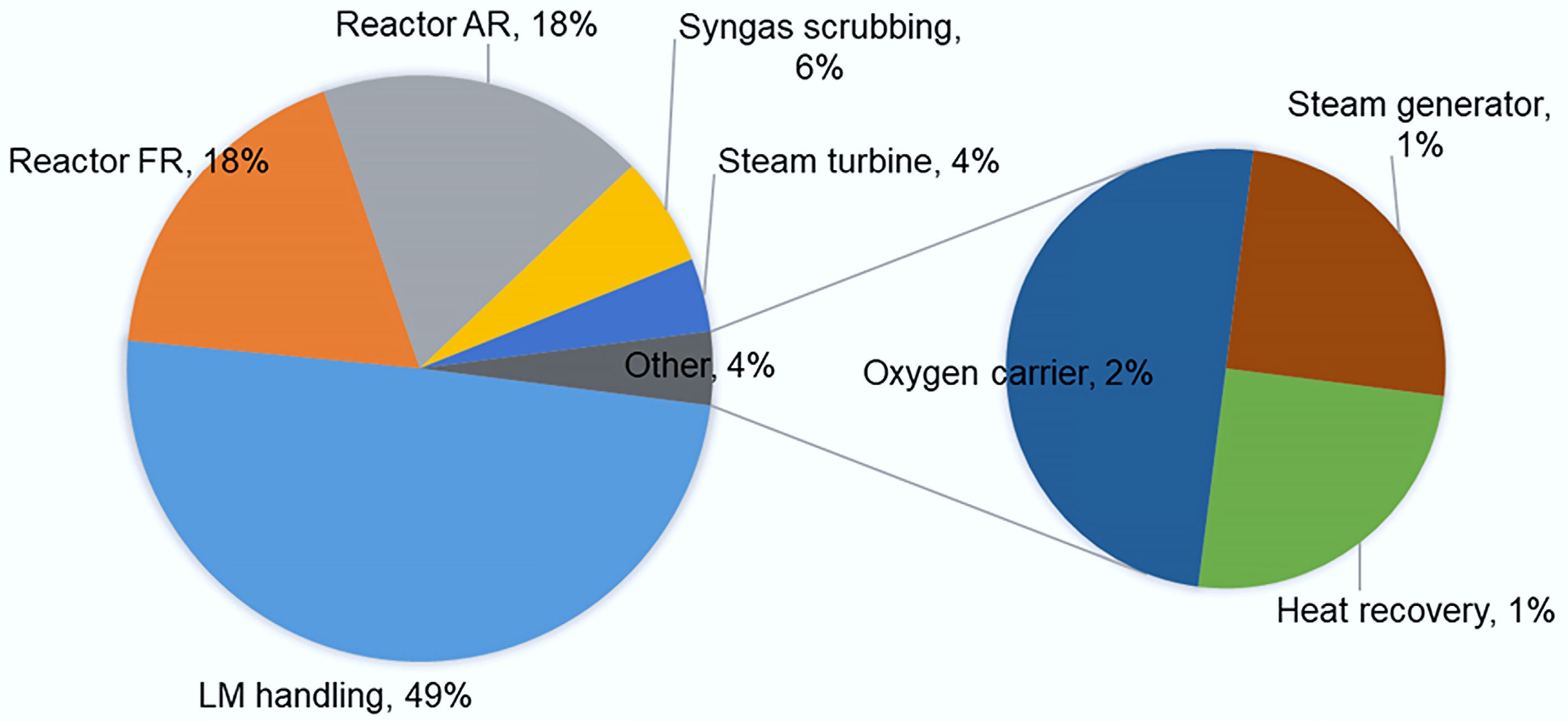 The cost breakdown shown in Fig. 3 is derived from a specific case study by Sarafraz et al.[62], which analyzed a chemical looping gasification system using a liquid medium as an oxygen carrier. It reflects the economic conditions, market indices, and operational factors particular to the studied region. Although the distribution of cost components, such as liquid metal handling (49%) and reactor operations (18%) offers valuable insights, it may not be universally applicable to regions with differing market conditions or feedstock prices. Variables like local energy costs, labor expenses, raw material availability, and regional regulations can significantly affect the cost structure. Therefore, while this breakdown is informative, it should not be broadly generalized without considering local contexts.