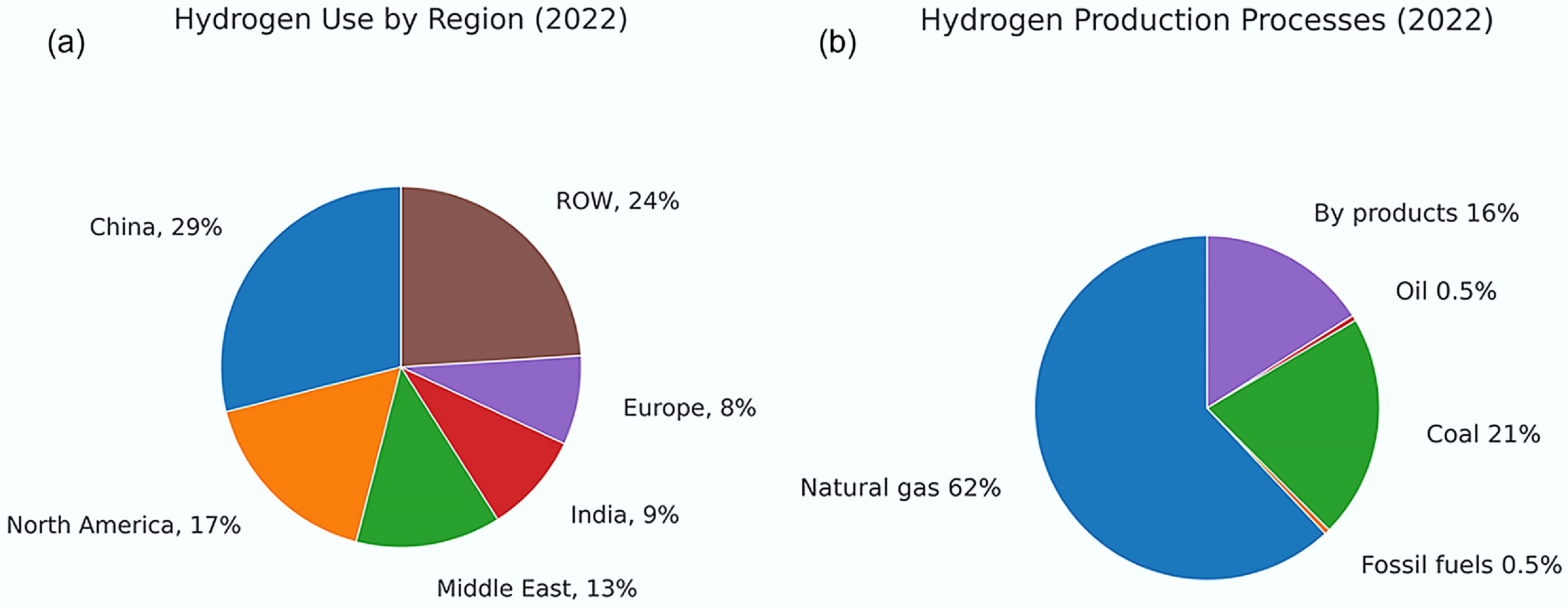 (a) Major application regions, and (b) production processes of H2 in 2022. Redraw based on the data from IEA[93].