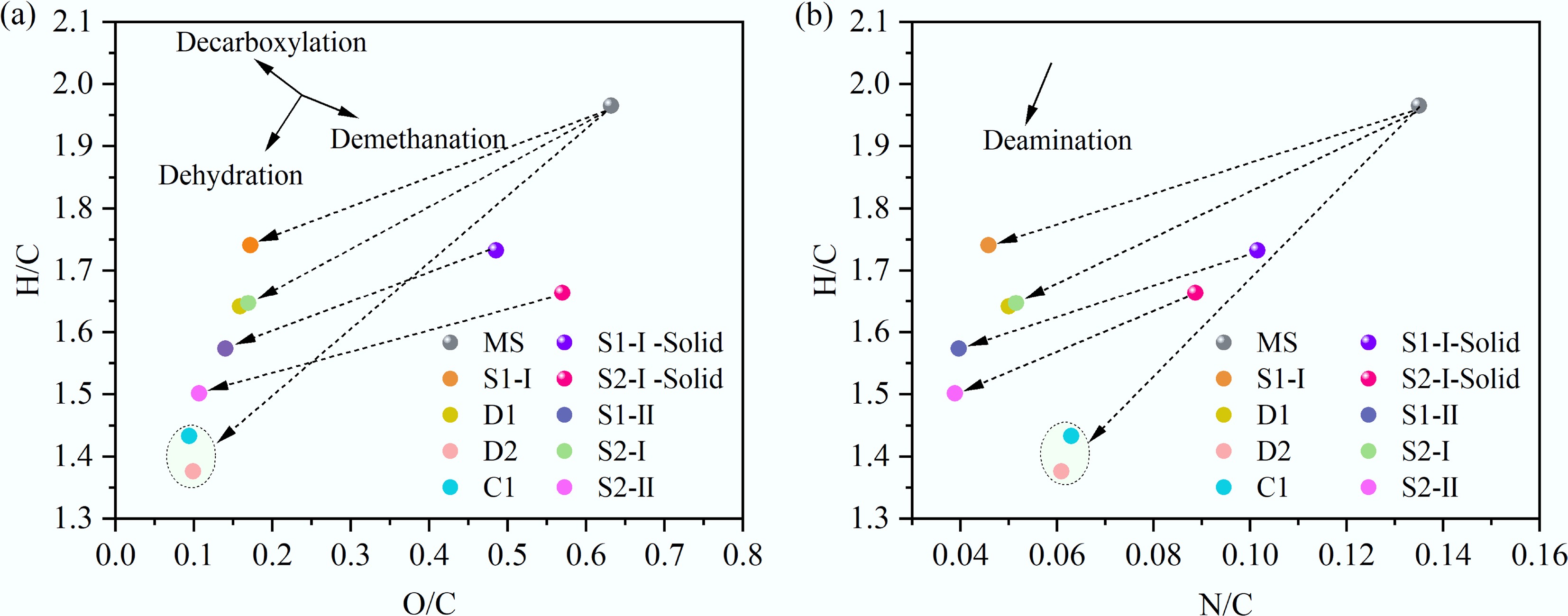 The Van Krevelen diagram helps to visualize the evolution pathways of MS and its products intuitively. In Fig. 3a, the transformation directions of H2O, CO2, and CH4 are marked, which correspond to dehydration, decarboxylation, and demethanation reactions, respectively. Starting from the feedstock and ending at the product, the slopes of straight lines for these reactions were 2, –1, and –0.5, respectively. All connecting lines between the starting and ending points in Fig. 3a have slopes between 2 and –1, suggesting that dehydration and decarboxylation dominate the HTL treatment. Decarboxylation removed COO and C=O groups by producing CO2 and CO gases. This transformation led to higher H/C and lower O/C ratios of the product. As temperature and time increased, the slope of the line gradually approached 2, indicating that dehydration became the predominant reaction, and thus, lower H/C and O/C ratios can be explained. Under severe reaction conditions, decarboxylation may weaken while demethanation strengthens. Figure 3b shows the transformation direction of NH3, which matches the deamination reaction with a slope of 3. Higher temperatures and longer residence times enhanced deamination, as confirmed by the comparison of the slopes of D1 and D2, as well as S1-I and S2-I. However, S1-II and S2-II did not follow this trend. This difference is related to the fact that their feedstock, which came from the solid products obtained by the first stage, was produced under different operating conditions.
