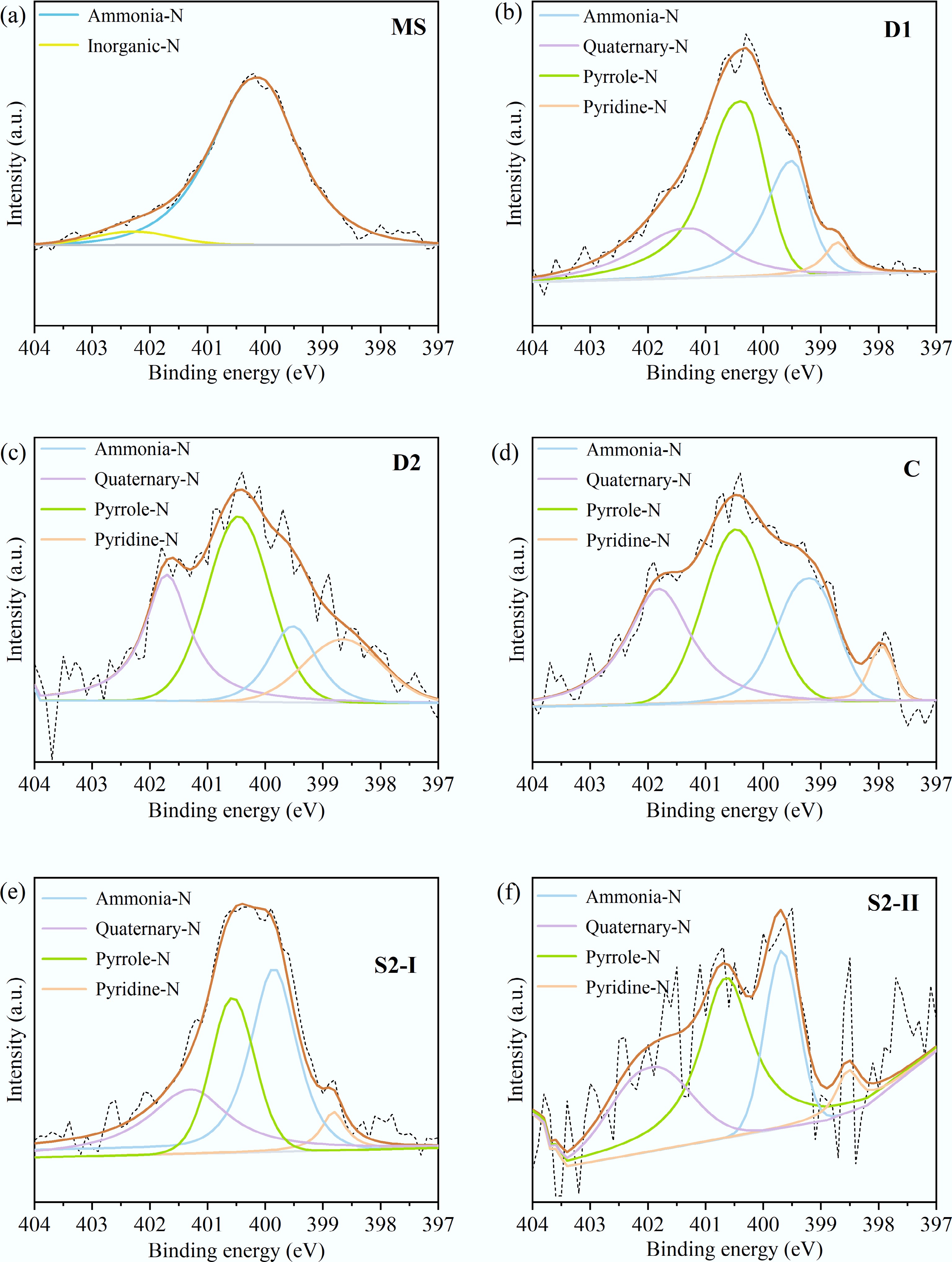 XPS spectra of N1s in the solid product from (a) MS, (b) D1, (c) D2, (d) C, (e) S2-I, and (f) S2-II.