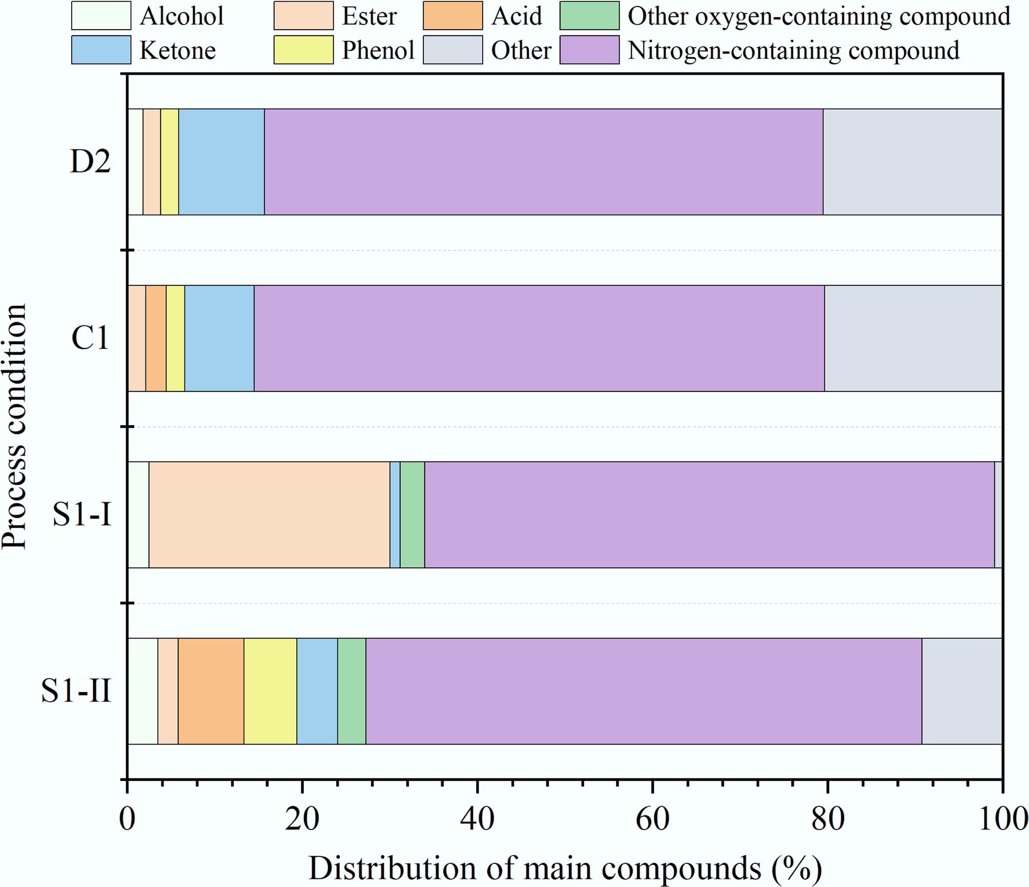 Aqueous phase samples obtained from three HTL processes (D2, C, S1) were analyzed by GC-MS. The contained compounds were categorized into alcohols, esters, acids, phenols, ketones, other oxygen-containing compounds, nitrogen-containing compounds, and the remaining compounds. Compounds with a relative peak area greater than 0.5% were selected, and their distribution is shown in Fig. 6. Nitrogen-containing compounds dominated all aqueous samples at 63.52%–65.09%, accompanied by certain amounts of ketones at 1.20%–9.79%, esters at 1.98%–27.47%, phenols at 0%–6.07%, acids at 0%–7.5%, and minor amounts of alcohols at 0%–3.47% as well as other oxygen-containing compounds at 0%–3.91%. Hydrocarbons were not detected due to their low solubility in water, which is consistent with the findings reported by Zhang et al.[15]. The nitrogen-containing compounds primarily consisted of nitrogen-containing heterocycles, including pyrroles, pyridines, pyrazines, piperazines, and pyrrolidine derivatives, along with minor amounts of amines and amides. Compounds like 2-pyrrolidinone and 1-methyl-2-pyrrolidinone can be formed via the Maillard reaction between amino acids (from protein hydrolysis) and reducing saccharides (from carbohydrate hydrolysis). The 13-Docosenamide might result from the ammonolysis of fatty acids. The proportion of nitrogen-containing compounds in the aqueous phase from S1-I was 65.08%, which is comparable to or even higher than that in other aqueous samples. This indicates that a significant portion of nitrogen can be transferred to the aqueous phase even under relatively short residence times and lower temperatures, thereby achieving a considerable nitrogen removal effect. Cyclic ketones were formed through the dehydration, isomerization, and cyclization of monosaccharides[16]. Phenolic compounds mainly originate from the cleavage of ether bonds in lignin, but the reaction typically occurs above 250 °C[17]. Therefore, no phenols were detected in the aqueous phase of S1-I.