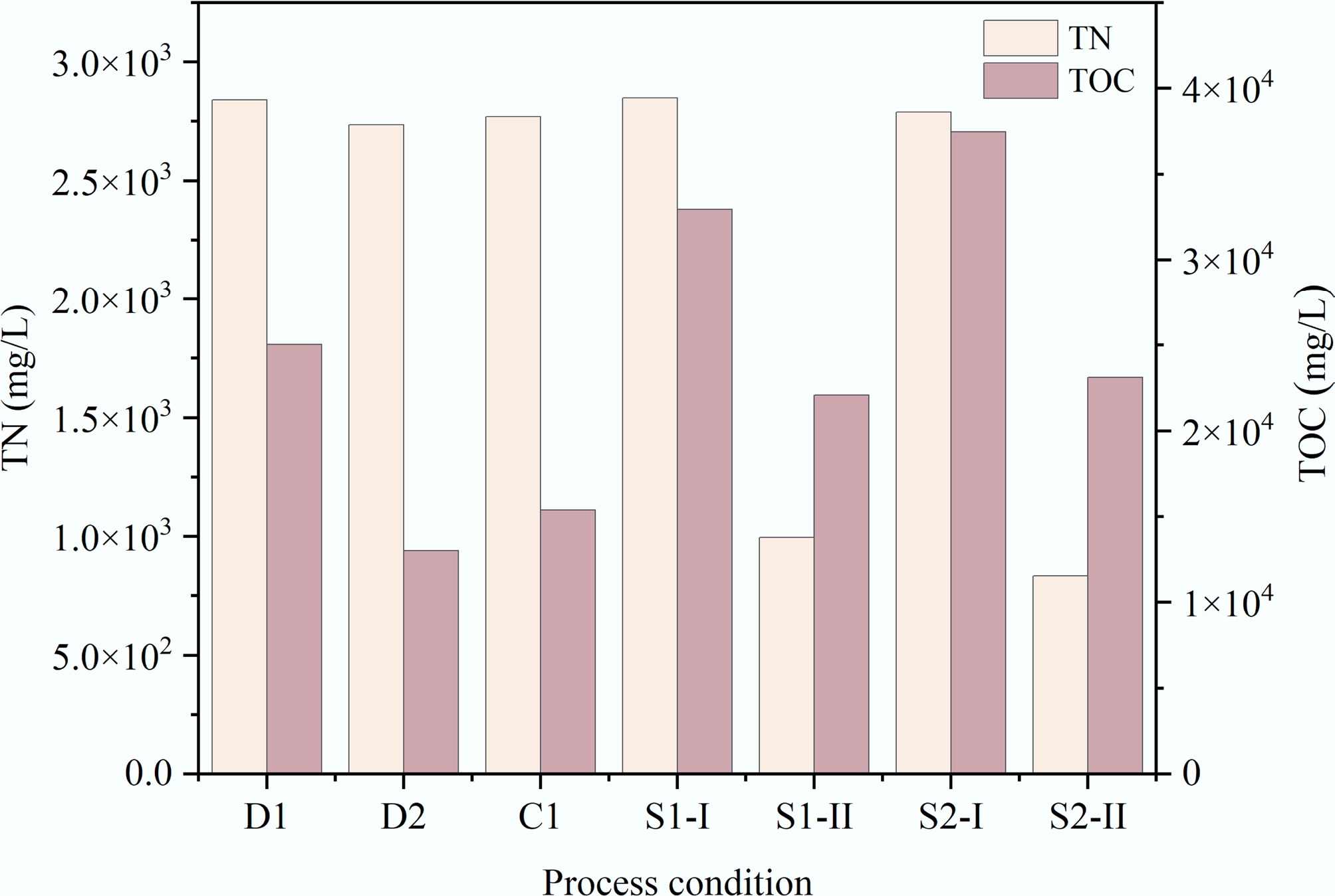 TN and TOC analysis data of the aqueous phase products from all HTL conditions are presented in Fig. 7. For D1, S1-I, and S2-I, the TN and TOC concentrations were 2,840 and 25,031, 2,850 and 32,950, and 790 and 37,460 mg/L, respectively. Compared to other conditions, these two indicators reached a relatively high level. This is because lipids, proteins, and carbohydrates were primarily incorporated into the aqueous phase through hydrolysis[6]. Under D2 and C, TOC significantly decreased, and TN also showed a descending trend. This indicates that high temperatures (> 300 °C) promote the repolymerization of organic compounds in the aqueous phase to form large nitrogen-containing molecules, which further migrate to the oil phase or decompose into the gas phase[18,19]. The TN concentrations of S1-II and S2-II were the lowest among all aqueous phase samples, with the values at 995 and 833.5 mg/L, respectively. Since the nitrogen content in the oil and solid phase products under S1-II and S2-II was also the lowest (see Sections 'Elemental compositions and proximate analysis' and 'GC-MS analysis'), nitrogen is effectively removed during the low-temperature pretreatment stage of ST-HTL based on the law of conservation of mass.