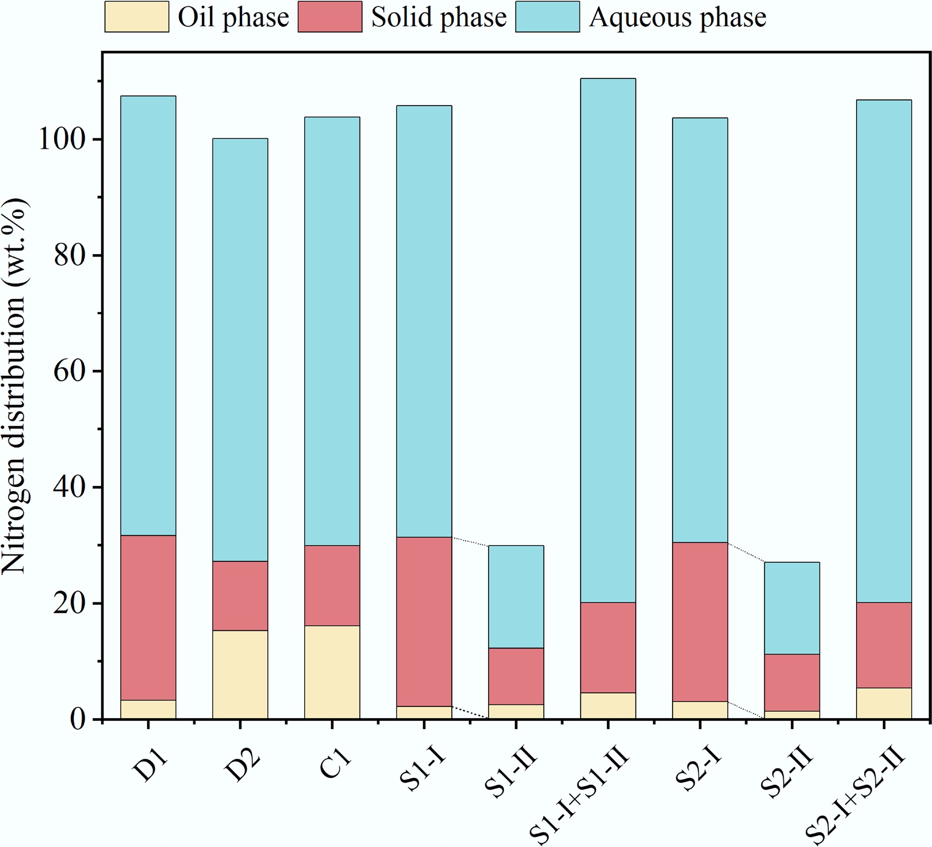 After S2-I, 73.26% of the nitrogen in MS transferred to the aqueous phase, 27.38% transferred to the solid phase, and only 3.08% transferred to the oil phase. The solid product from S2-I is used as the feedstock for S2-II, and it degrades under higher temperatures. As a consequence, the proportions of ammonia-N, pyrrole-N, quaternary-N, and pyridine-N in the S2-I solid product are redistributed with the occurrence of deeper reactions.