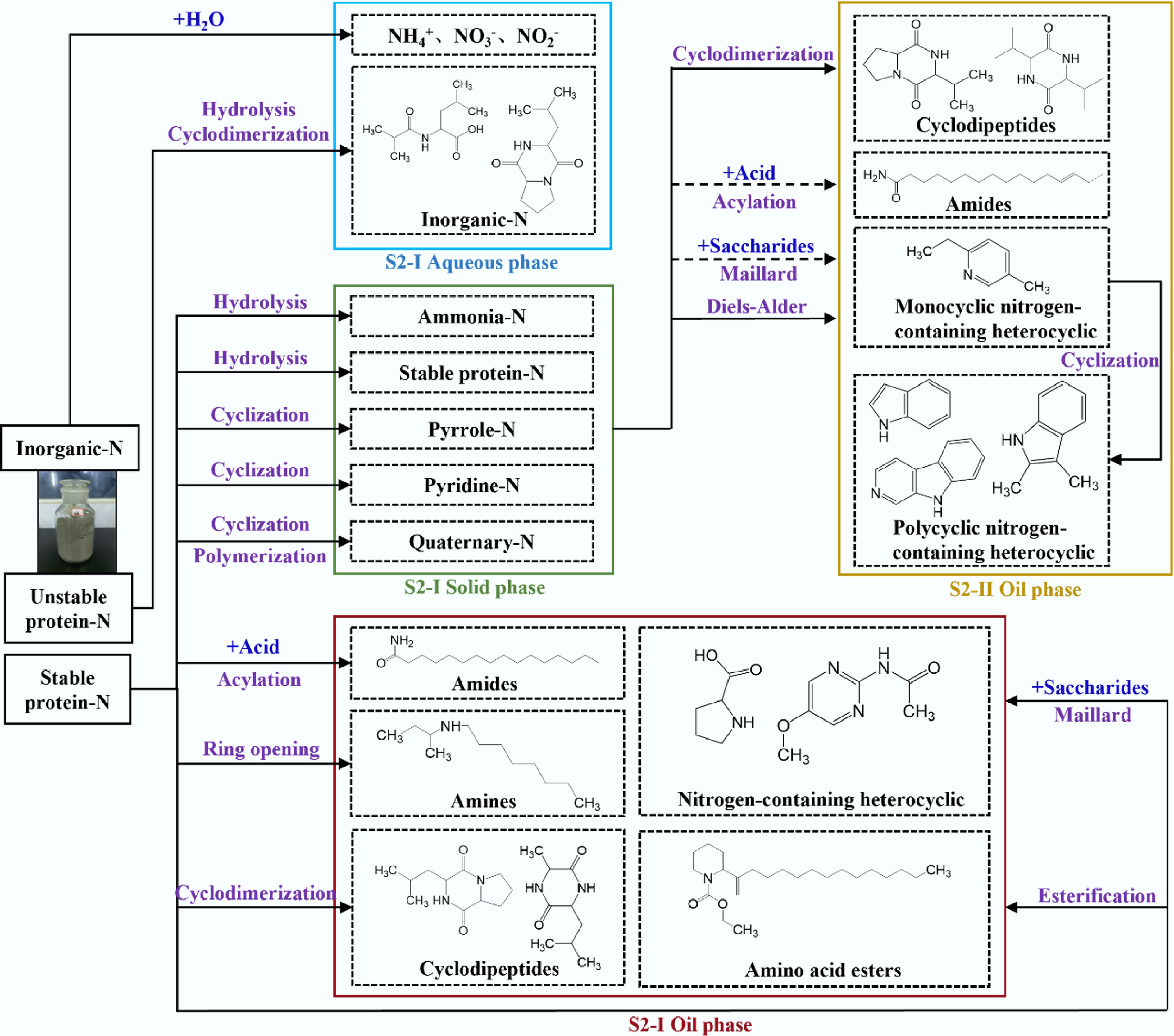 At low temperatures, inorganic-N is prone to decomposition to generate NH4+, NO3−, and NO2−. Among these, NO2− is easily oxidized to NO3−, which then migrates to the aqueous phase. In addition to nitrogen-containing ions, organic nitrogen in the aqueous phase originates from the hydrolysis of unstable protein-N and subsequent cyclodimerization reactions. Pyrrolic, quaternary, and a small amount of pyridine-N in the solid product are mainly derived from cyclization and polymerization of stable protein nitrogen. Nitrogen-containing compounds in the oil-phase products include cyclodipeptides, nitrogen-containing heterocycles, amides, and amines. Specifically, cyclodipeptides (e.g., pyrazinedione) are formed by the cyclodimerization of ammonia-N. Nitrogen-containing heterocyclic compounds (e.g., pyrrolidine, pyrrolidone, pyrimidine, pyrazine, imidazole) are produced via the Maillard reaction between ammonia-N and reducing saccharides. Amides are generated through the acylation reaction of NH3 (derived from the decomposition of ammonia-N) with fatty acids, and amines can be formed by the ring-opening reaction of stable fractions in ammonia-N.