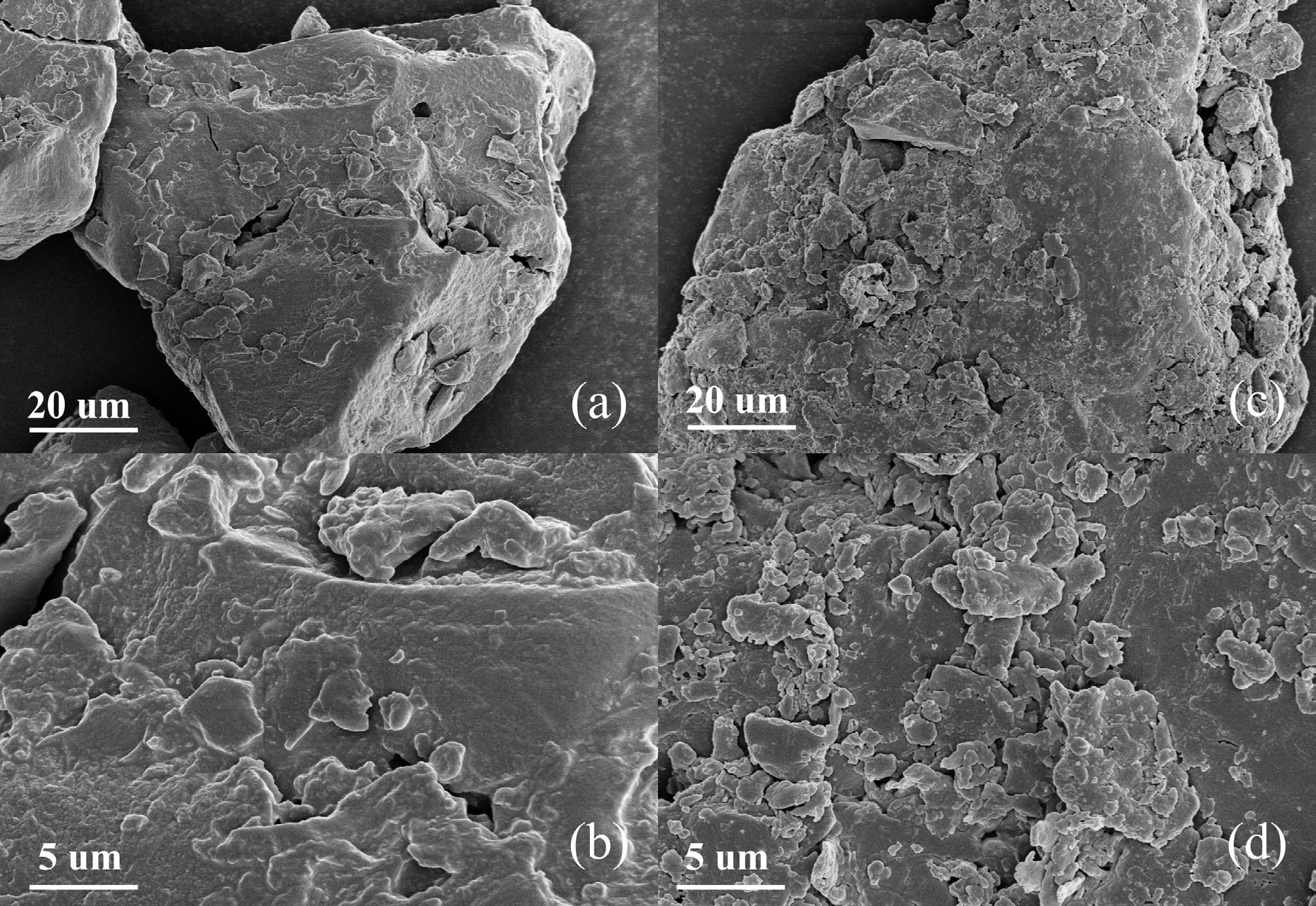 Sample Tagua nut (%) Bodhi root (%) Mannose 87.59 88.01 Ribose 0.40 0.38 Glucuronic acid 2.08 2.34 Galacturonic acid 0.30 0.27 Glucose 3.39 2.39 Galactose 2.73 4.39 Xylose 1.35 0.13 Arabinose 2.14 2.06 Fucose 0.02 0.03 The SEM results of the raw material powders are shown in Fig. 1. Bodhi root exhibited a rough surface, whereas tagua nut showed a relatively smooth surface. This is because the tagua nut has a harder texture than the bodhi root. Specifically, the hard texture enabled the tagua nut to form a smooth cross-section more easily during the grinding process. As a result, the relatively rough surface of the bodhi root provided a larger specific surface area, which was beneficial for the subsequent pyrolysis.
