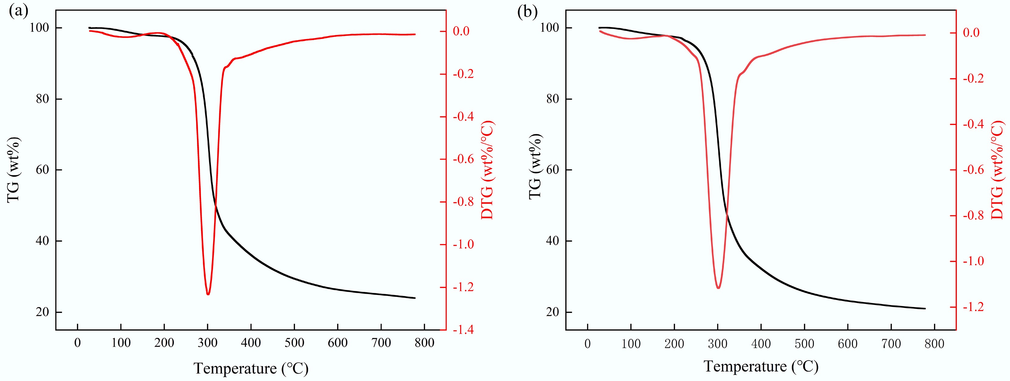 Figure 2 illustrates the thermogravimetric (TG) and derivative thermogravimetric (DTG) curves of tagua nut and bodhi root samples subjected to heating from 20 to 800 °C at a heating rate of 10 °C/min under a nitrogen atmosphere. The weight loss characteristics of these materials markedly differed from those observed in typical lignocellulosic biomass raw materials (e.g., straw, sawdust), primarily due to their predominant composition of mannan-type hemicellulose, as detailed in Tables 3 and 4. The DTG curves revealed that the pyrolysis of tagua nut and bodhi root proceeded through three distinct stages. The initial stage, spanning 20 to 180 °C, corresponded mainly to the evaporation of free moisture. The second stage (180 to 380 °C) represented the rapid pyrolysis stage, during which mannan-type hemicellulose underwent depolymerization, dehydration, and other decomposition reactions. Concurrently, a large amount of volatiles was released, leading to significant weight loss. The highest weight loss rates of tagua nut and bodhi root were observed at 301 and 302 °C, respectively. The weight loss peak temperatures were relatively higher than those reported for xylan-type hemicellulose (~268 °C) but lower than the typical decomposition temperature of cellulose (~350 °C)[29,30], corroborating the predominance of mannan in these materials. The final stage, from 380 to 800 °C, was characterized by carbonization, evidenced by a reduced weight loss rate and the formation of biochar. At 800 °C, the residual mass of tagua nut (24 wt%) exceeded that of bodhi root (21 wt%), consistent with the proximate analysis results indicating a higher fixed carbon content and lower volatile content in tagua nut.