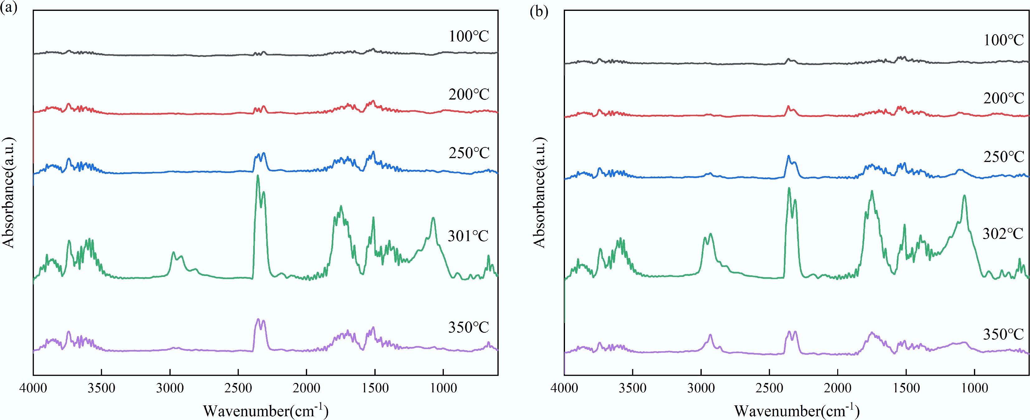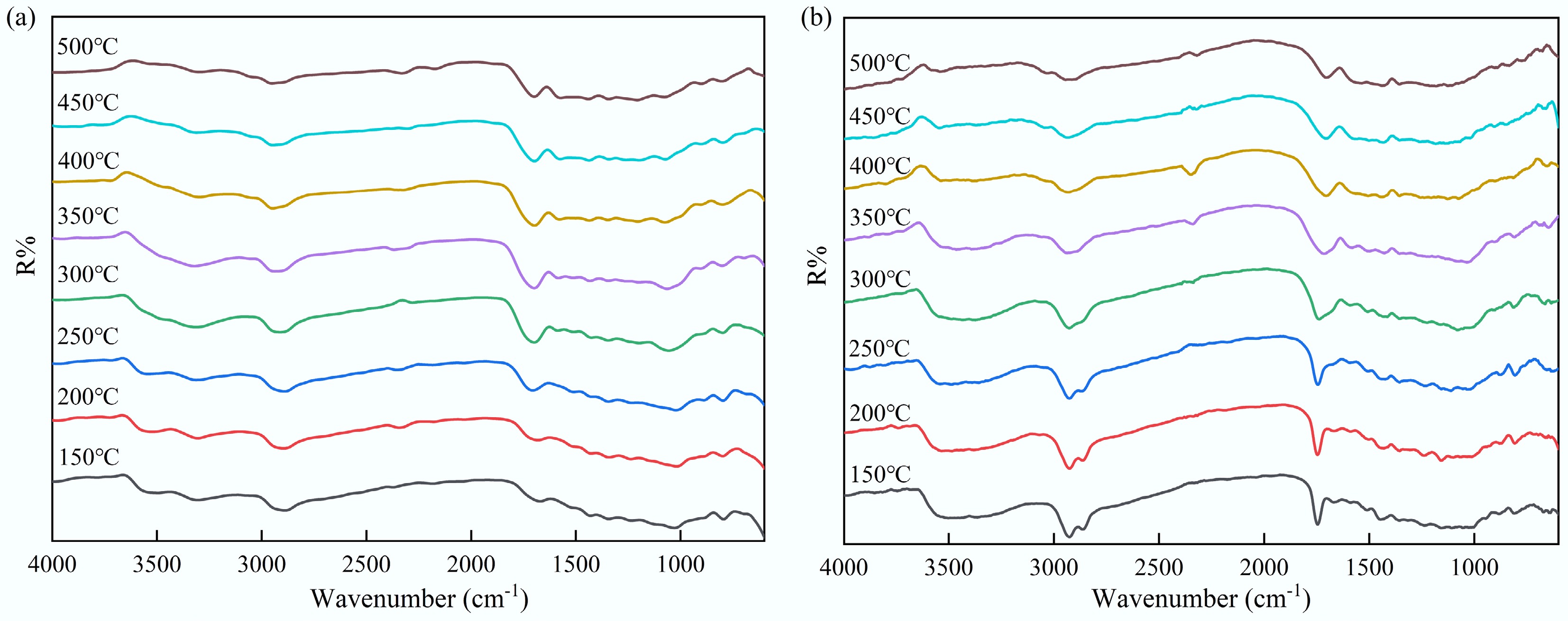 The in-situ DRIFT experiment was employed to characterize the structural transformation occurring in the solid phase during the slow pyrolysis of feedstocks. Figure 4 presents the in-situ DRIFT spectra of the pyrolysis of tagua nut and bodhi root over a temperature range of 150 to 500 °C. Below 250 °C, the spectra profiles of both materials were largely similar. However, at 450 °C, the vibration peaks corresponding to the principal functional groups disappeared. This observation aligned with the TG-FTIR results, which identified the primary weight loss interval for both feedstocks to be between 180 and 380 °C. These findings indicated that the decomposition of the functional groups in the solid phase was directly associated with the weight loss observed during pyrolysis. In addition, although the residual functional groups continued to evolve beyond 400 °C, the generation of volatile products was comparatively limited.
