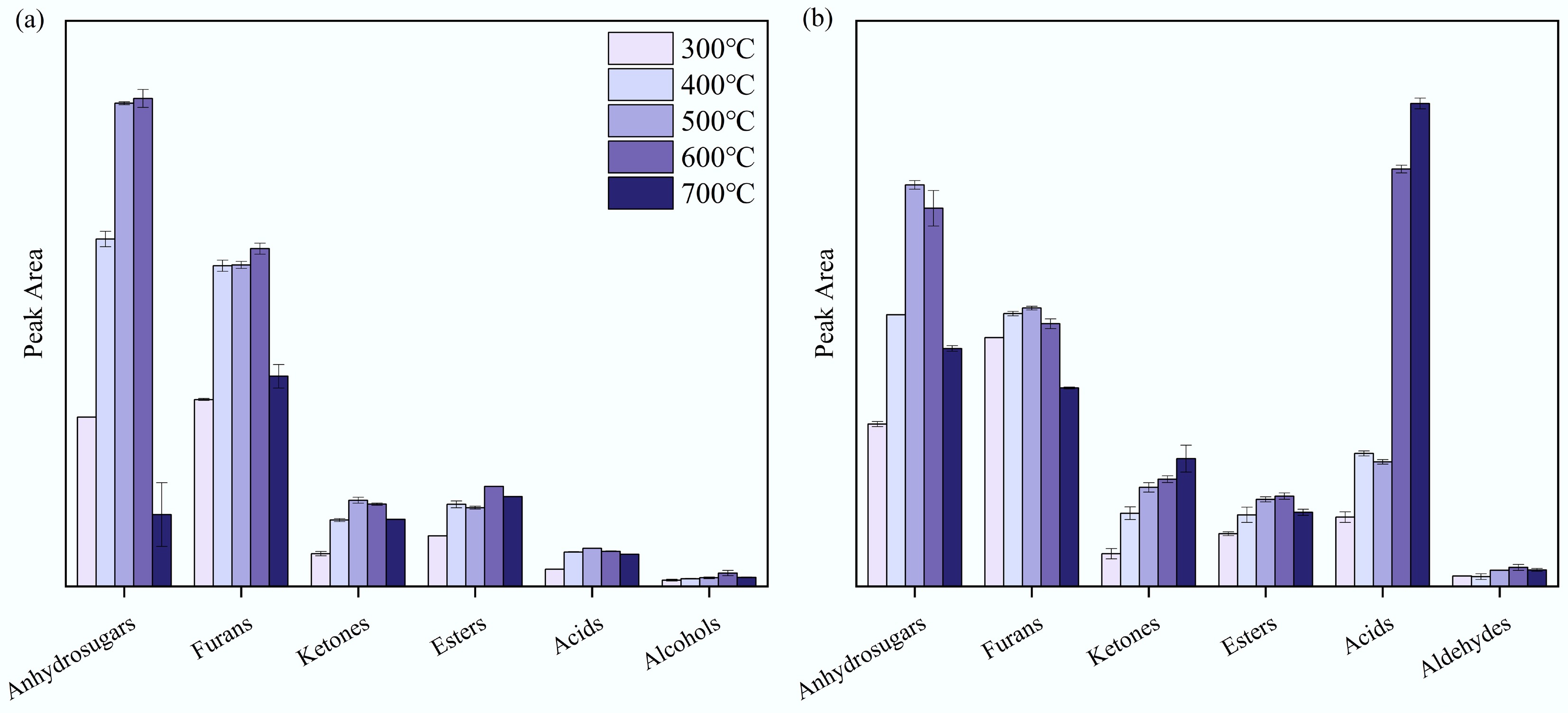 Similarly, the pyrolysis products of bodhi root exhibited a trend where their peak areas increased up to 600 °C, before decreasing at higher temperatures. Anhydrosugars and furan compounds dominated as pyrolysis products across both low and high temperature ranges. Among anhydrosugars, LM accounted for 95% of the peak area at 500 °C. The primary furan derivatives were 5-HMF and FF, which made up 47% and 21% of the furan peak area at 600 °C, respectively. Notably, the peak area of dodecanoic acid gradually increased with rising pyrolysis temperature, eventually becoming one of the main products.